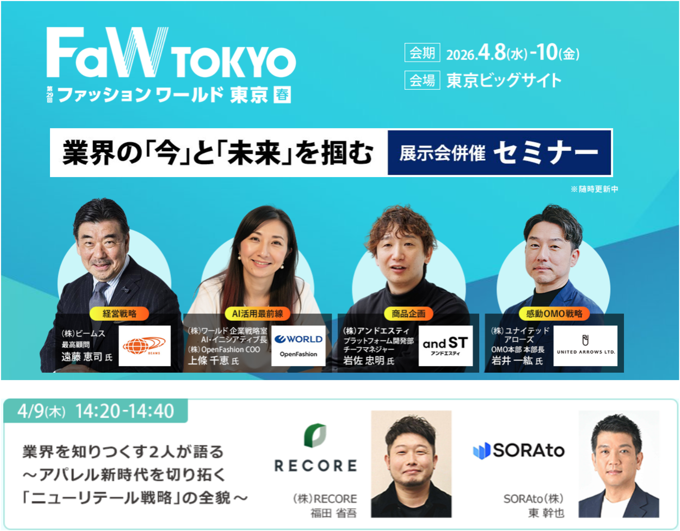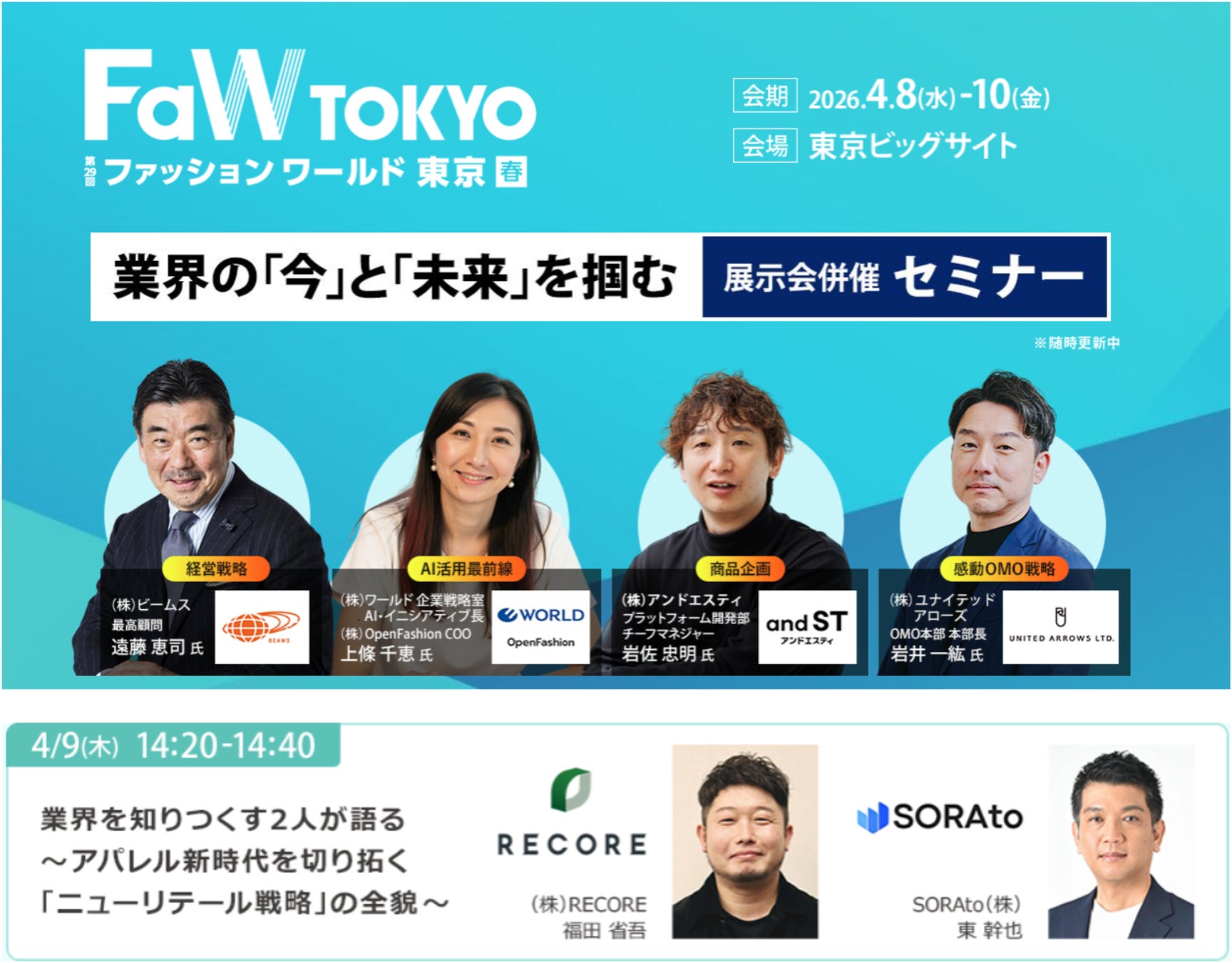 アパレル、EC、リユース、物流、ITソリューションなど幅広い分野の企業が出展し、業界の最新トレンドや取り組みを発信。また、専門セミナーや製品・サービス紹介セッションを通じて、ファッションビジネスの高度化やサステナブルな取り組み、EC・リユース活用など、業界の課題解決につながる情報が提供されます。このような場での出展により、RECOREはファッション・アパレル業界との接点を強化するとともに、リユース・在庫活用・EC運用を支援するソリューションの認知向上と、業界全体の発展への貢献を目指してまいります。
