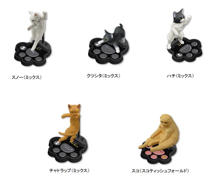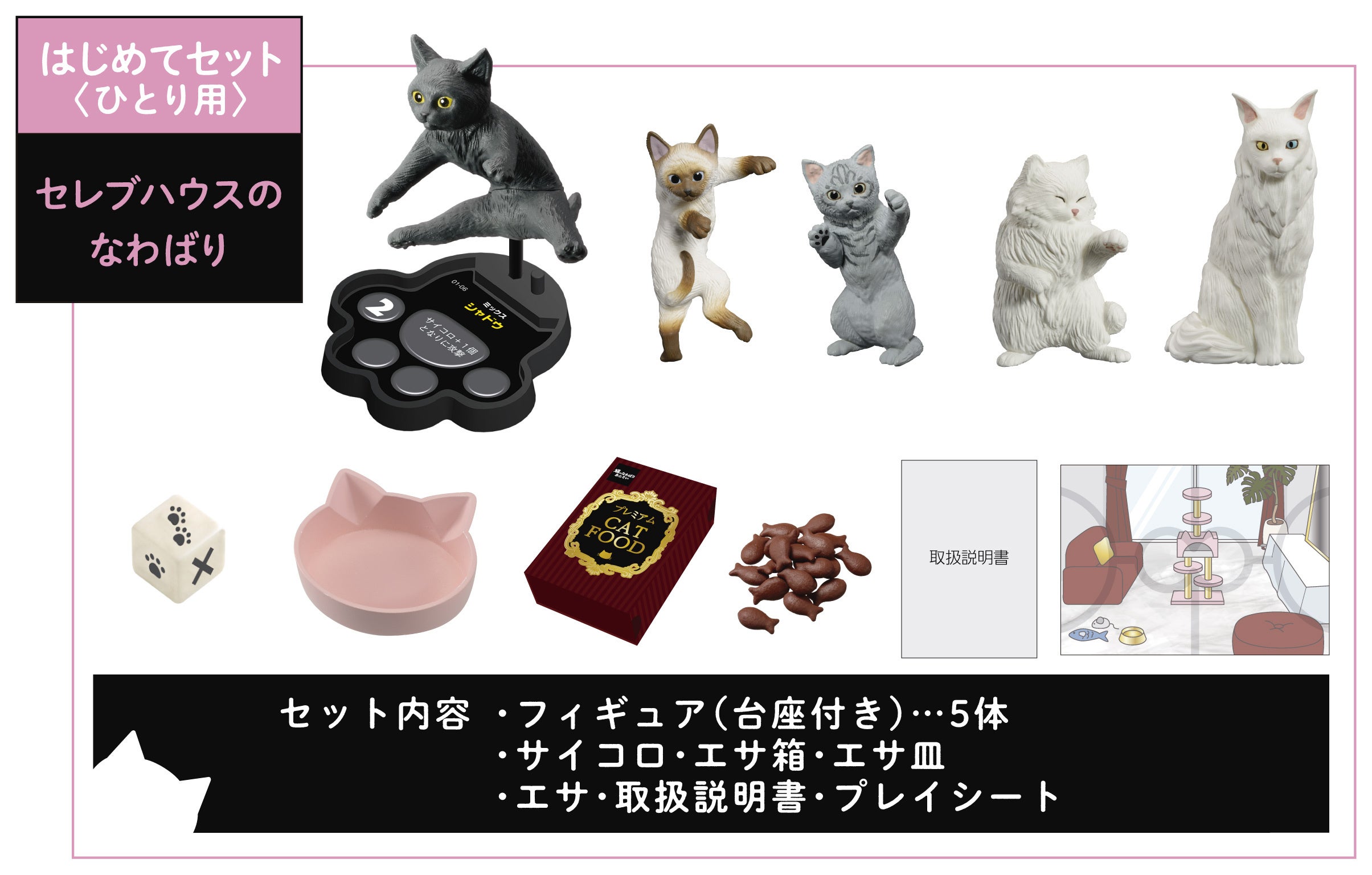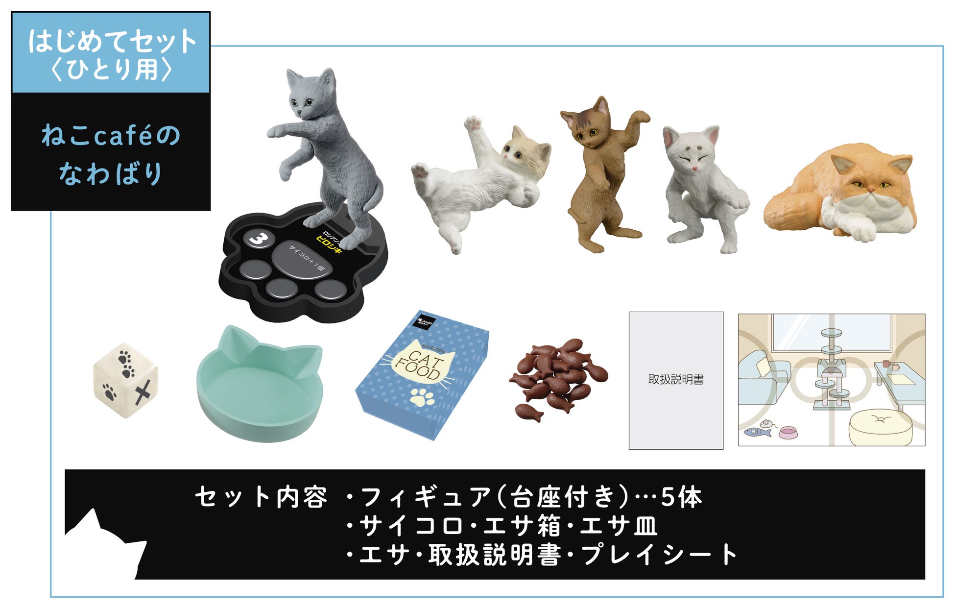 | セット内容 | ・猫フィギュア(台座付き)×5 個 ・サイコロ×1 個 ・エサ×24 個 ・エサ箱×1 個 ・エサ皿×1 個 ・プレイシート×1 枚 |