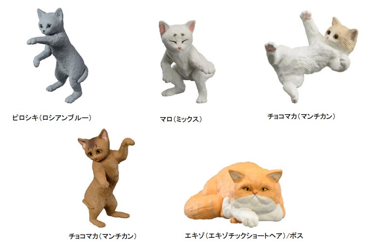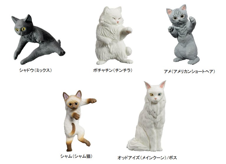 本商品は、猫たちの個性的な技を使ってボス猫を倒し、なわばりを獲得する新感覚のフィギュアゲームです。 『猫のなわばりあらそい はじめてセット<ひとり用> ~ねこ café のなわばり~』にはピロシキ(ロシアンブルー)、マロ (ミックス)、チョコマカ(マンチカン)、クレオパトラ(アビシニアン)、エキゾ(エキゾチックショートヘア)の全 5 種、『猫のな わばりあらそい はじめてセット<ひとり用> ~セレブハウスのなわばり~』にはシャドウ(ミックス)、ポチャチン(チンチラ)、シャム(シャム猫)、アメ(アメリカンショートヘア)、オッドアイズ(メインクーン)の5種の猫のフィギュアが付属します。 それぞれのフィギュアは猫の躍動感のあるポーズが全高約 62 ㎜にデフォルメされており、ポーズに合った‘猫パンチ’ や‘へそ天’など、猫ならではの個性的な技が設定されています。