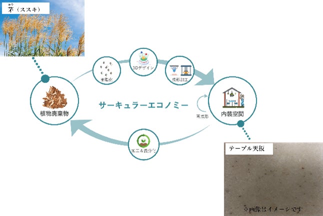 本イベントで採取した茅(ススキ)は、Spacewaspの植物性廃棄物を活用した持続可能な建材開発技術により樹脂に混合され、スーパーホテルPremier阿蘇熊本空港のラウンジで使用するテーブルの天板材料として活用されます。