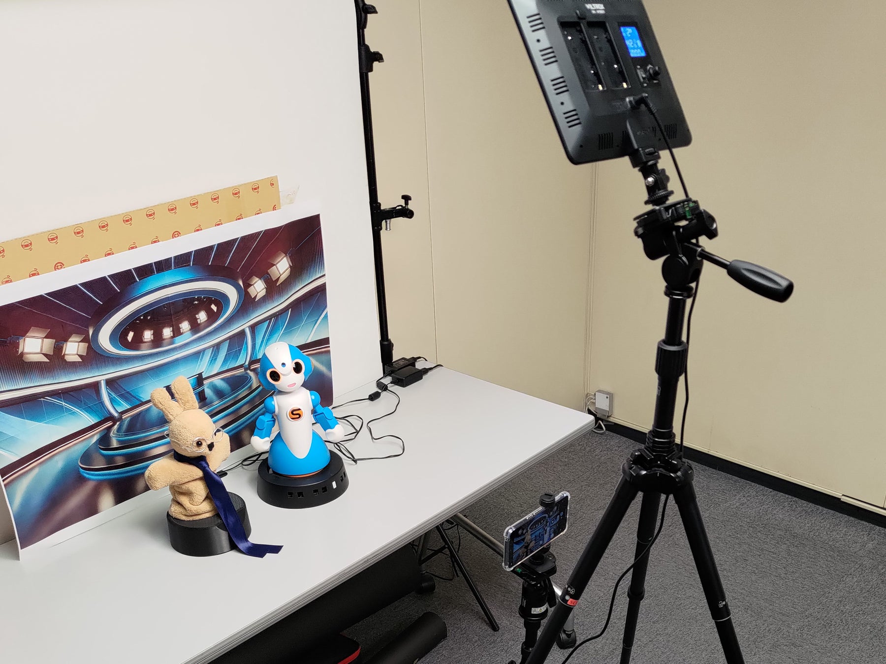 2台のコミュニケーションロボットが対話する場面の背景セットには、ChatGPTから出力された画像をプリントアウトし使用しています。あえて合成などの後処理を利用せず、撮影時の実際の背景として設置することで、動画編集におけるトータルの製作工数を削減することを目指しています。