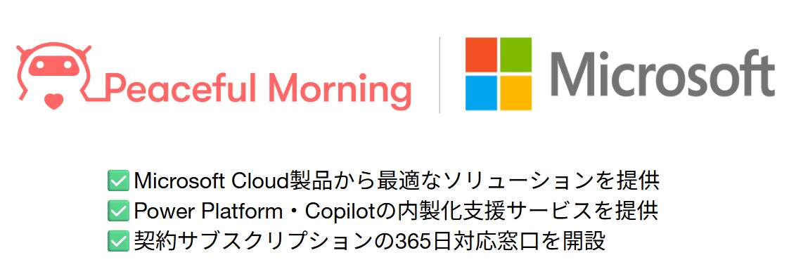 Peaceful Morningは、Microsoft認定パートナーとして、これまで以上に企業のDX推進に貢献してまいります。豊富なDX人材と内製化支援の実績を活かし、Microsoft製品の導入・活用を通じて、お客様のビジネス変革を強力に後押しいたします