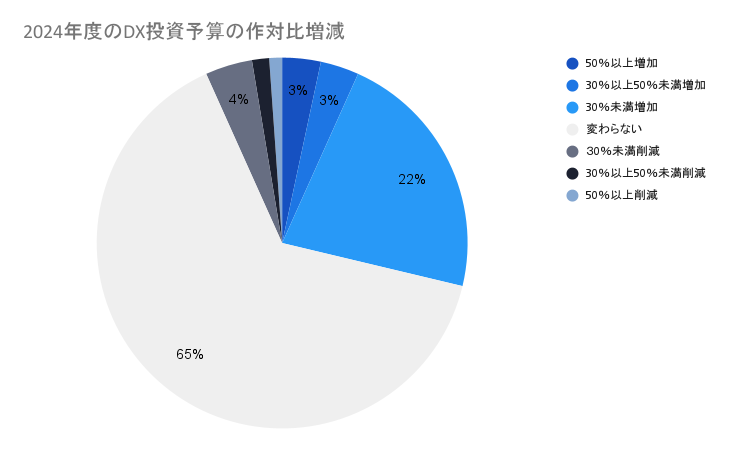 3)2024年度のDX投資に関する予算について、「増加」と回答したのは合計28%と、3割にも届かなかった。「(昨年度と)変わらない」という回答が最も多く、65%だった。