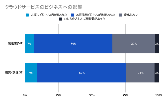 2)クラウドサービスを導入したことによるビジネスの影響を訊いた設問では、製造業全体の66%が「大幅に改善」もしくは「ある程度改善」したと回答。その内、「購買・調達」に従事する人でみるとその割合は76%となった。
