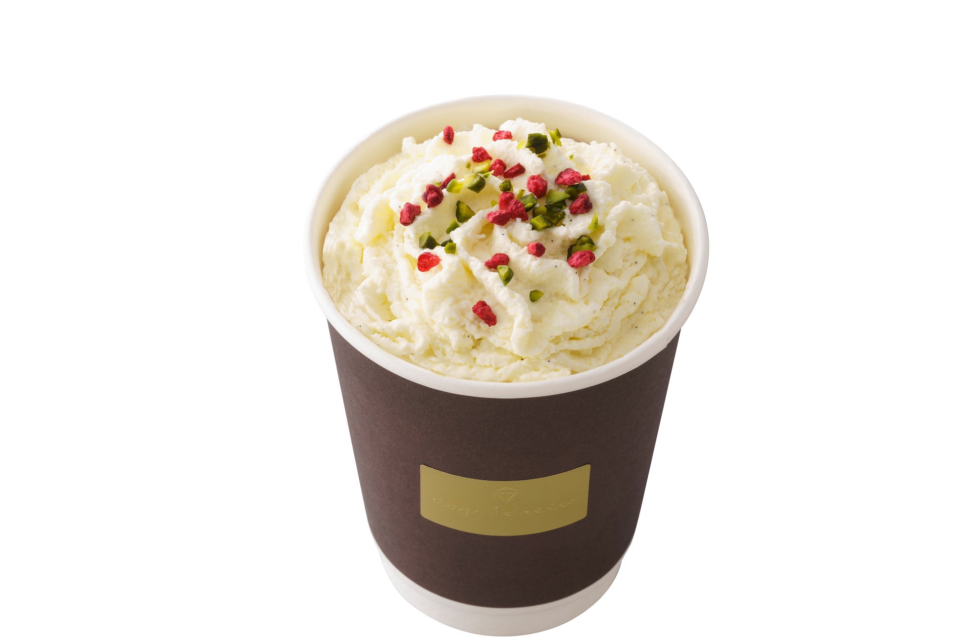 バニラが香るホワイトチョコのショコラドリンクに、ホワイトクリスマスをイメージしたシャンティをのせ、ドライフランボワーズとピスタチオを散りばめました。