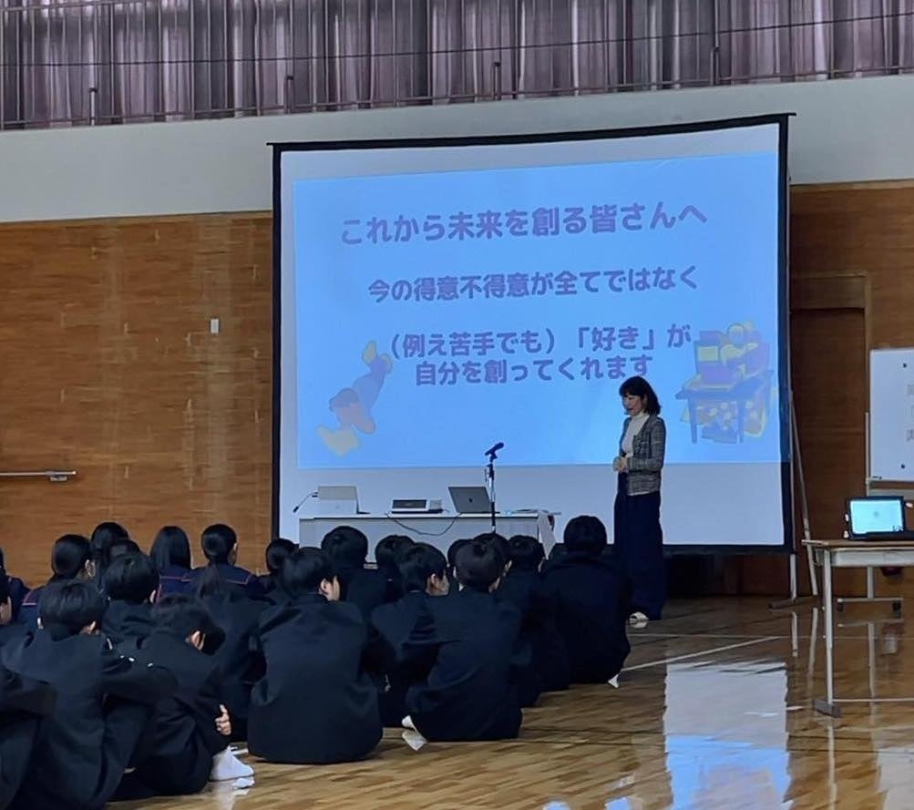 椎葉は、「自分の未来の創り方」という題で、自身のキャリアを紹介しながら中学生の皆さんに「好きなこと」を見つけることの大切さとそれに向かう子ども等へのエールを送りました。