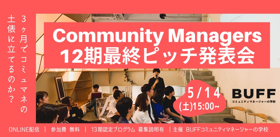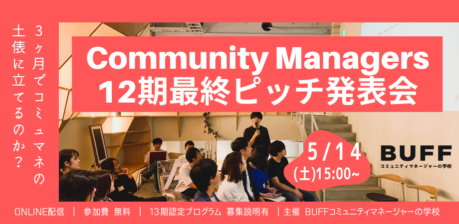 第12期生が3ヶ月間の受講成果をプレゼンする最終審査会を実施します。BUFFコミュニティマネージャーの学校および第13期募集概要についてもご説明します。