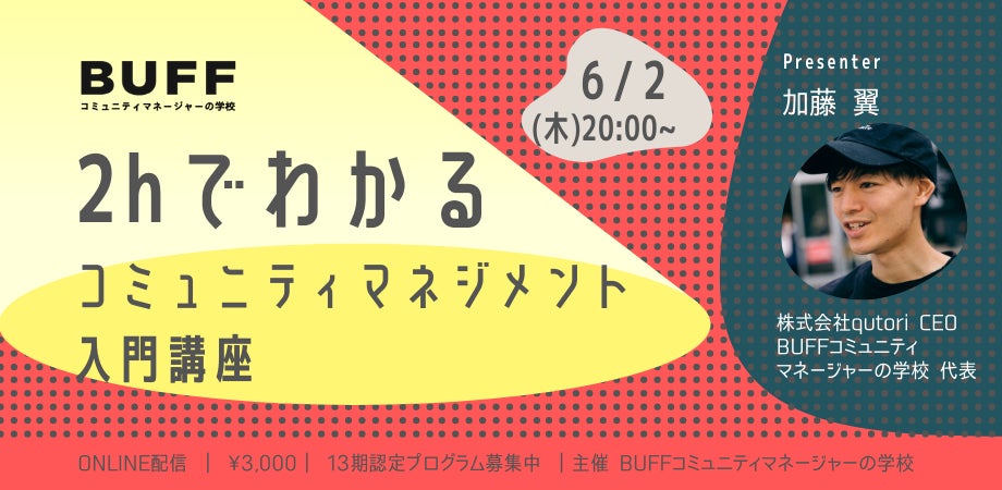 BUFF コミュニティマネージャー の学校( https://buff-community.jp/ )を運営する株式会社qutori(本社:東京都渋谷区 代表取締役:加藤翼)は、 プロフェッショナルなコミュニティマネージャーを育成する、 第13期の認定プログラムの募集を開始しました。募集に際し、第12期生が3ヶ月間の受講成果をプレゼンする最終審査会や、応募前にプログラムの雰囲気を味わえる体験ONLINE講座も合わせて実施します。