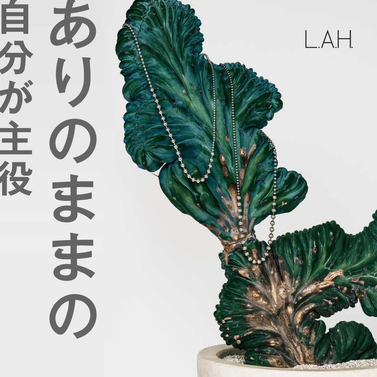 L.A.H.では、素材「ありのまま」のシルバーの特性を「ヌードシルバー」と呼んでいます。白い輝きが美しいボールチェーンのネックレスは、「経年美化」によりオリジナリティある風合いへ育てていく喜びがあります。