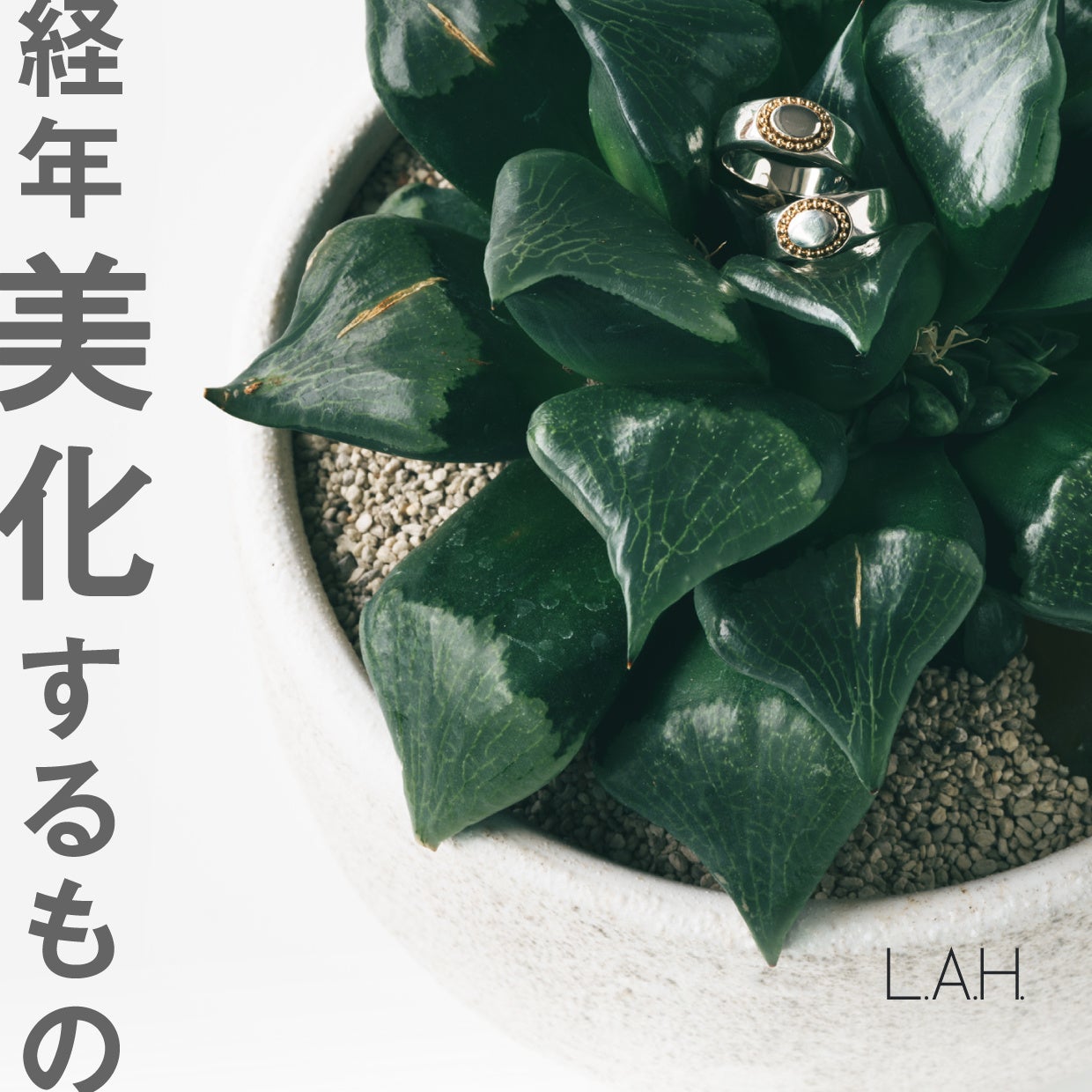 期間限定ストアは、シルバー素材本来の白さ、美しさから、自分の肌に馴染み、共に過ごした傷や時の経過で色づく風合いを「経年美化」と称えるジュエリーブランド<L.A.H.>と、同じ価値のもと「いい顔している植物」をコンセプトに独自の美しさを提案する植物屋<叢(くさむら)>、年月を重ね、時代と海を越えて愛されてきた「ヴィンテージ」アイテムを扱う<VCM(Vintage Collection Mall)>とが集いました。