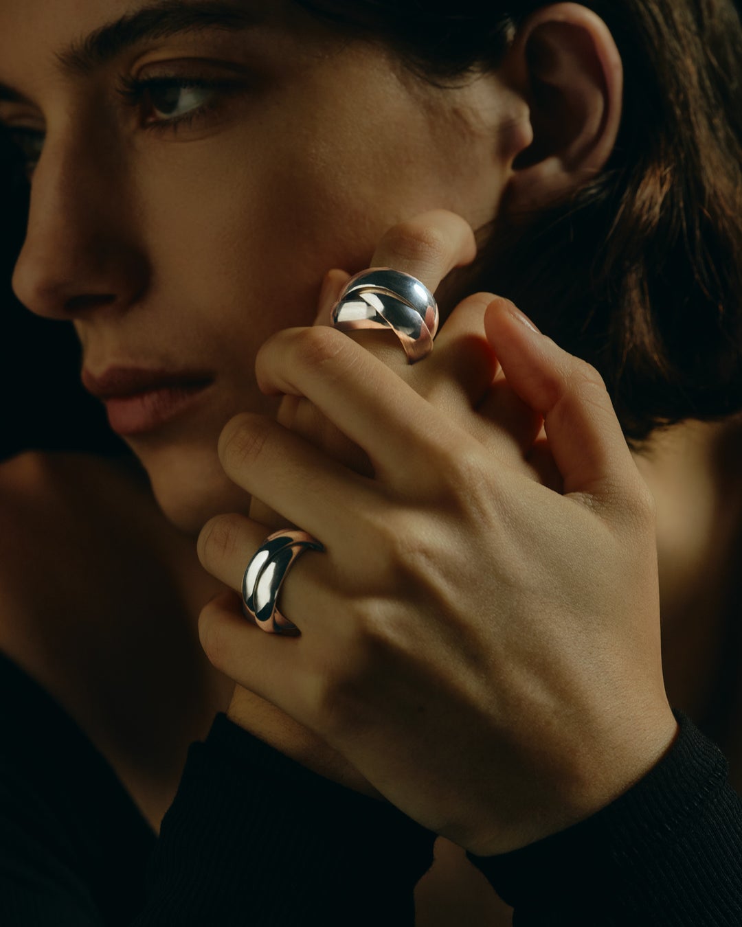 幅広のリングを重ね、構築的な厚みと陰影を堪能するデザインに。