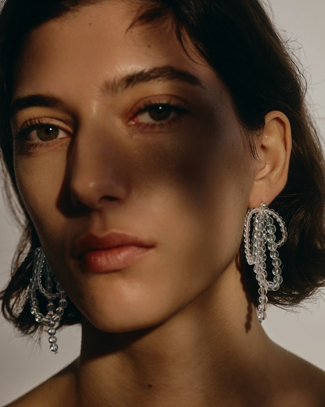 クリスタルで構築されたフープが重なり合い、耳元に奥行きと丸みのある存在感を生み出すピアス。金具にはシルバー925を使用しています。