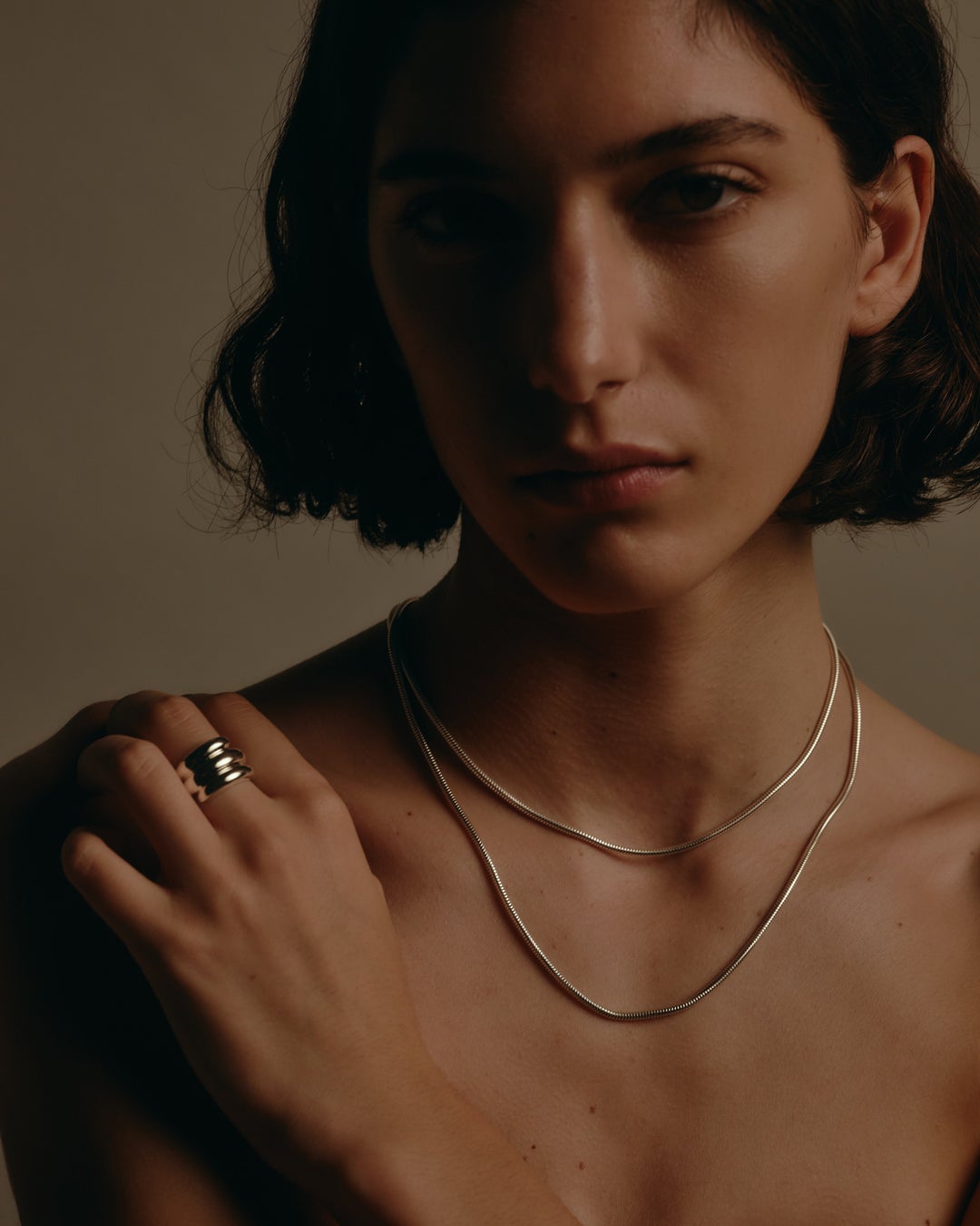 連なりの美しいシルバーが、光を静かに抱え込み、肌の上に流れるようなラインを生み出します。