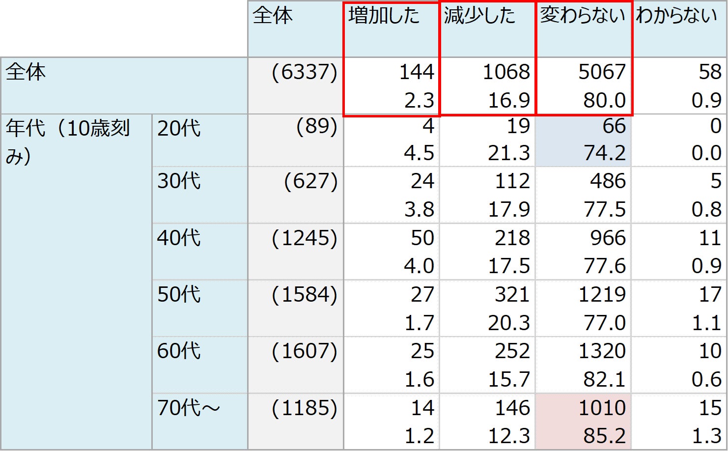 直近の6ヶ月において、米の価格上昇にともない、お米を食べる頻度が変化したかを尋ねたところ、「変わらない(80.0%)」、「減少した(16.9%)」、「増加した(2.3%)」という結果となりました。「変わらない」と回答した理由については「米が好きだから」「主食だから」「値上しているが他の食品も同様だと思うから」等が挙げられました。「減少した」と回答した理由については、「高価だから」が最多でした。