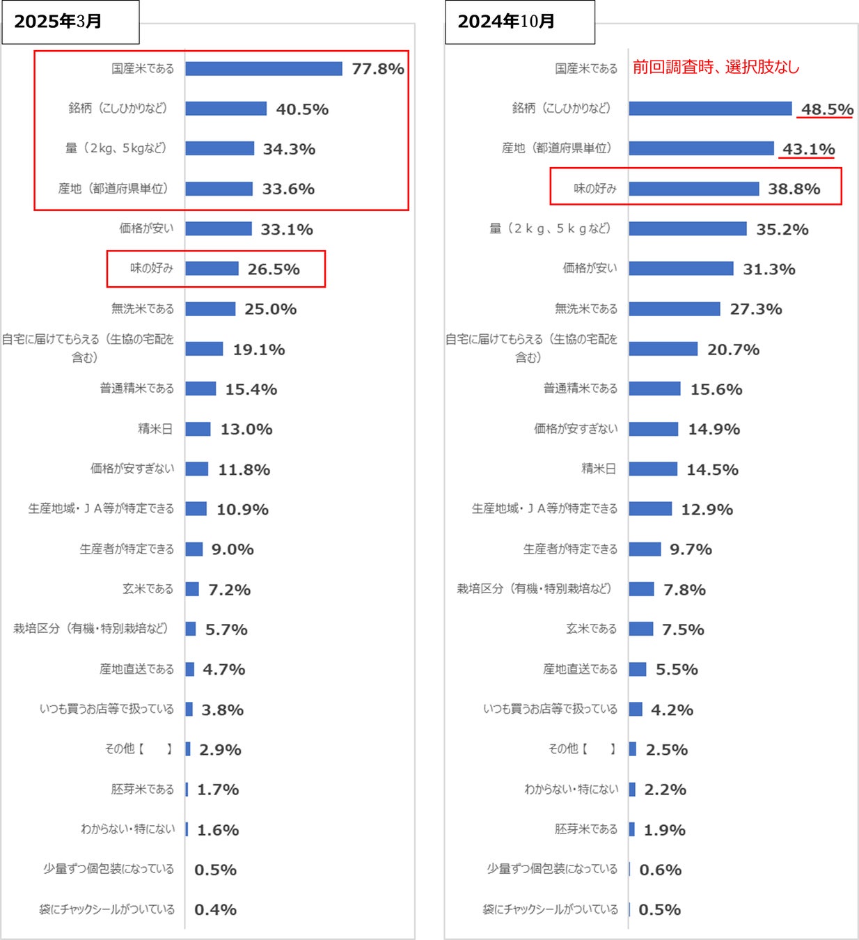 お米を買うときに重視することについて尋ねたところ、「国産米である(77.8%)」、「銘柄(40.5%)」、「量(34.3%)」、「産地(33.6%)」が上位を占める結果でしたが、一方で前回2024年10月調査と比較すると、「銘柄」は8.0%、「産地」は9.5%減少となりました。特に「味の好み(26.5%)」は12.3%の大幅減少となっており、前回調査では第3位でしたが、今回調査では第6位までランクダウンしました。一方で「価格が安い(33.1%)」は1.8%増加しており第5位にランクインしました。お米の価格上昇が続いた場合に重視しなくなることについて最も多かった回答は「わからない・特にない(33.9%)」でしたが、その後「銘柄(30.4%)」、「産地(19.0%)」が続き、直近の価格高騰の影響により、価格以外で、お米について重視する事・こだわる事が減少する結果となりました。