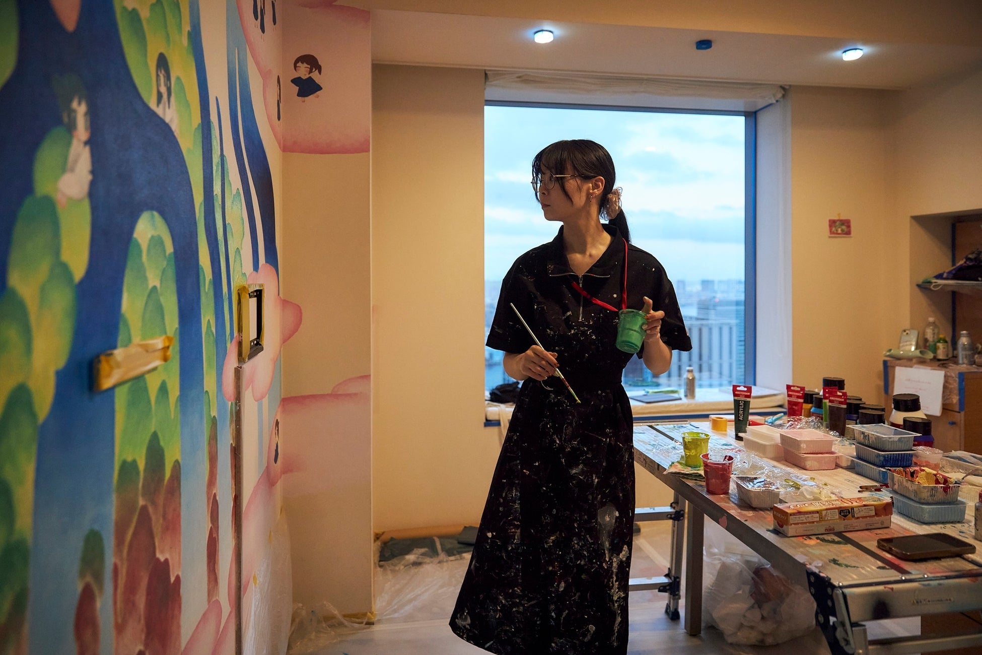 壁に描かれた少女たちは、東京上空のこの公園で自由に軽やかに遊んでいる。旅行中の非日常をさらに感じながらもリラックスできる、パステルカラーでドリーミーな客室として仕上げた。