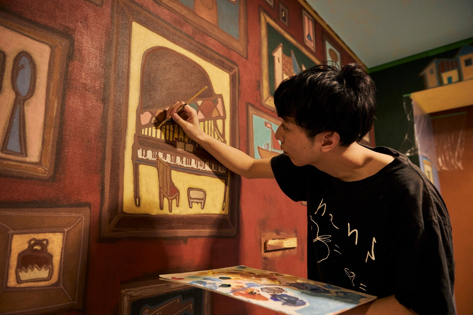 描かれた大きなキャラクターは自然そのものを擬人化した姿であり、小さなキャラクターたちはその土地に残る記憶や痕跡などの目に見えないものたちを表しています。巌をつたい流れる滝や、山々と富士山、太陽と月、空を飛ぶ鳥や足元で波打つ海など、さまざまな風景をひとつの部屋に閉じ込めました。