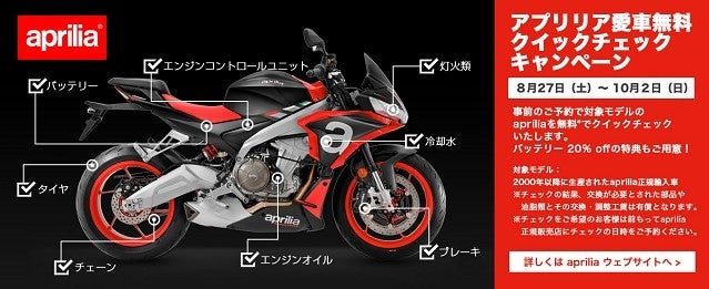 - 内 容 : アプリリア正規販売店にて期間限定の特別無料点検を実施 (点検項目:灯火類、ブレーキ、タイヤ、エンジンオイル、ドライブチェーン、冷却水エンジンコントロールユニット、バッテリー灯火類、ブレーキ、タイヤ、エンジン オイル、ドライブチェーン、冷却水エンジンコントロールユニット、バッテリー)