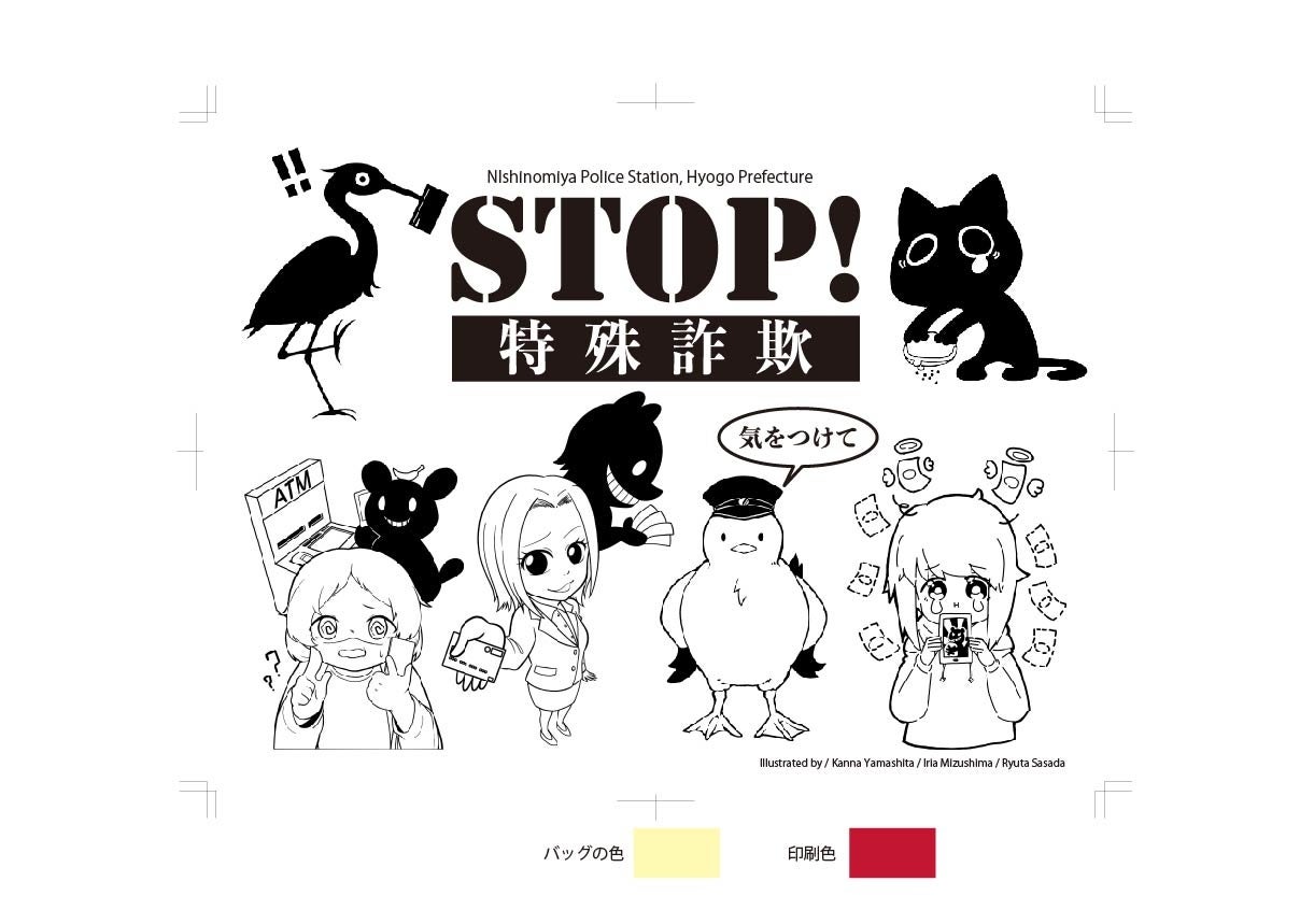 西宮市が県下において特殊詐欺被害発生件数が非常に多い地域であることから、被害撲滅のために様々な世代に関心を持ってもらいたいと考えた西宮警察署からの依頼で連携がスタート。買い物など日常的に使用するエコバッグにイラストを採用することで、幅広い世代に注意喚起を行い、「特殊詐欺を絶対に許さない」という風潮を生み出すことがねらいです。