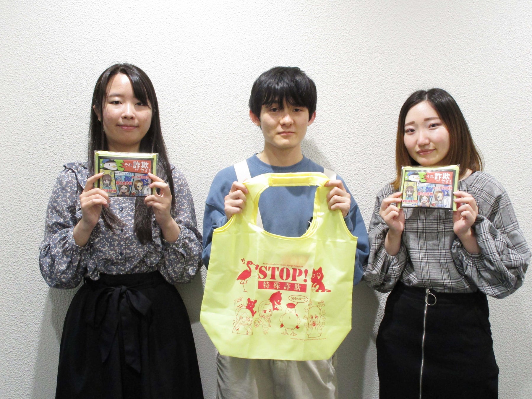 ①「特殊詐欺撲滅!」親しみやすいイラストで注意喚起 ②4/30(土) 13時~JR西宮駅前で学生が配布活動