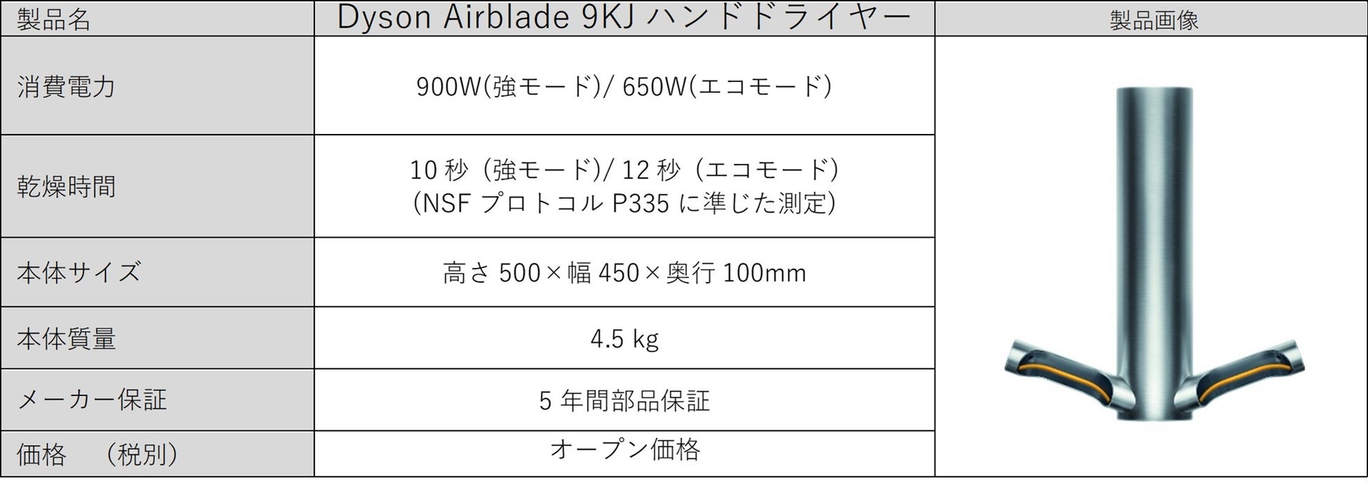 チーフエンジニアの1人、ジェイク ダイソンは次のように述べています。「手の乾燥は、速く衛生的に行うだけではなく、使用に必要なエネルギー効率にも責任を負うべきだと私たちは考えます。2006年に最初のDyson Airblade™ハンドドライヤーを発売し、業界に革新的な解決法を提示しました。Dyson Airblade 9kJハンドドライヤーでは、ユーザーエクスペリエンスや衛生面を一切犠牲にすることなく最高の性能を発揮できるよう、音響からデザインまで全てを見直しました。」