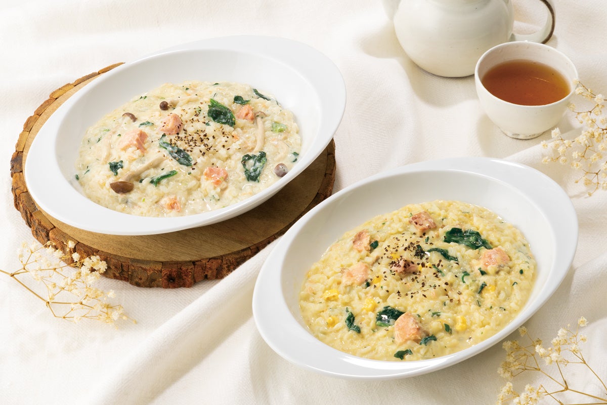 ごろっと鮭にほうれん草、チーズを、季節限定メニュー用に特別に炊いた玄米入りご飯と、豆乳スープで絡めています。