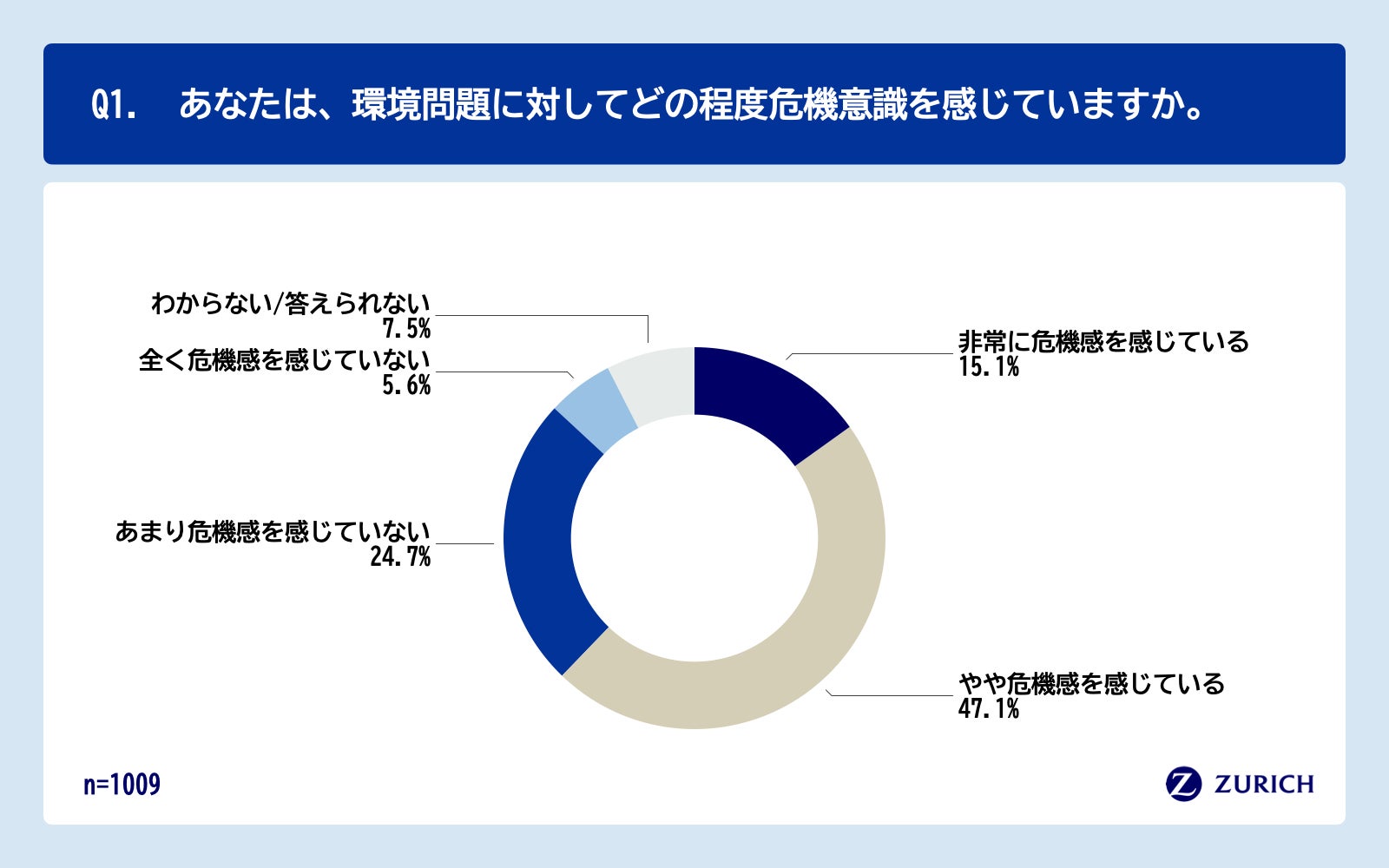 「Q1.あなたは、環境問題に対してどの程度危機意識を感じていますか。」(n=1009)と質問したところ、「非常に危機感を感じている」が15.1%、「やや危機感を感じている」が47.1%という回答となりました。
