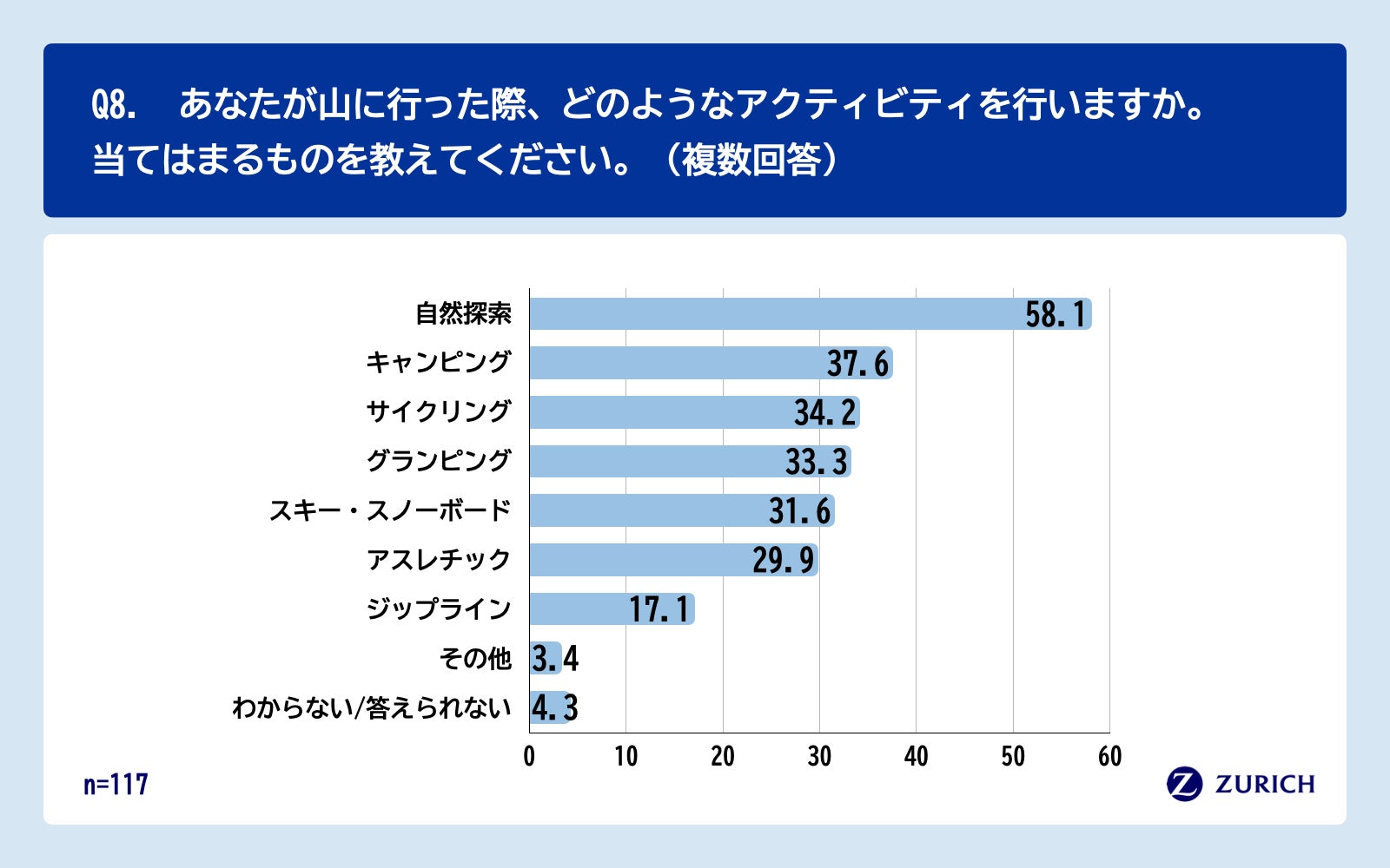 Q6で「山に行ったとき」と回答した方に、「Q8.あなたが山に行った際、どのようなアクティビティを行いますか。当てはまるものを教えてください。(複数回答)」(n=117)と質問したところ、「自然探索」が58.1%、「キャンピング」が37.6%、「サイクリング」が34.2%という回答となりました。