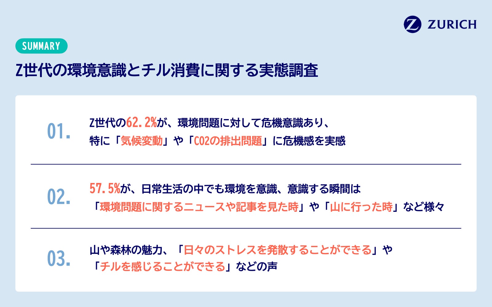 チューリッヒ保険会社(東京都中野区、日本における代表者および最高経営責任者:西浦 正親)は、Z世代の環境意識とチルに関する実態調査を実施しました。