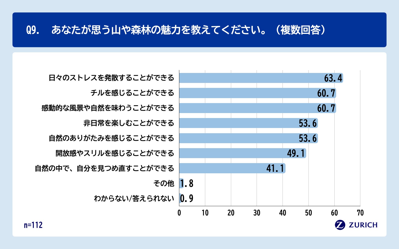 Q8で「わからない/答えられない」以外を回答した方に、「Q9.あなたが思う山や森林の魅力を教えてください。(複数回答)」(n=112)と質問したところ、「日々のストレスを発散することができる」が63.4%、「チルを感じることができる」が60.7%、「感動的な風景や自然を味わうことができる」が60.7%という回答となりました。