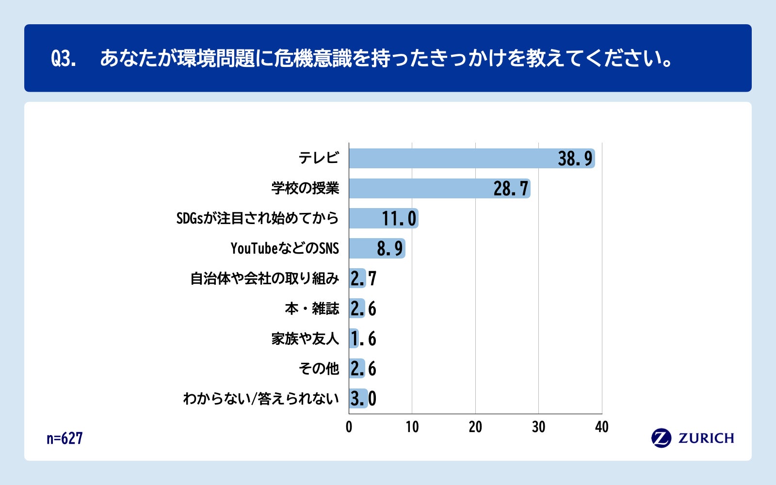 Q1で「非常に危機感を感じている」「やや危機感を感じている」と回答した方に、「Q3.あなたが環境問題に危機意識を持ったきっかけを教えてください。」(n=627)と質問したところ、「テレビ」が38.9%、「学校の授業」が28.7%、「SDGsが注目され始めてから」が11.0%という回答となりました。