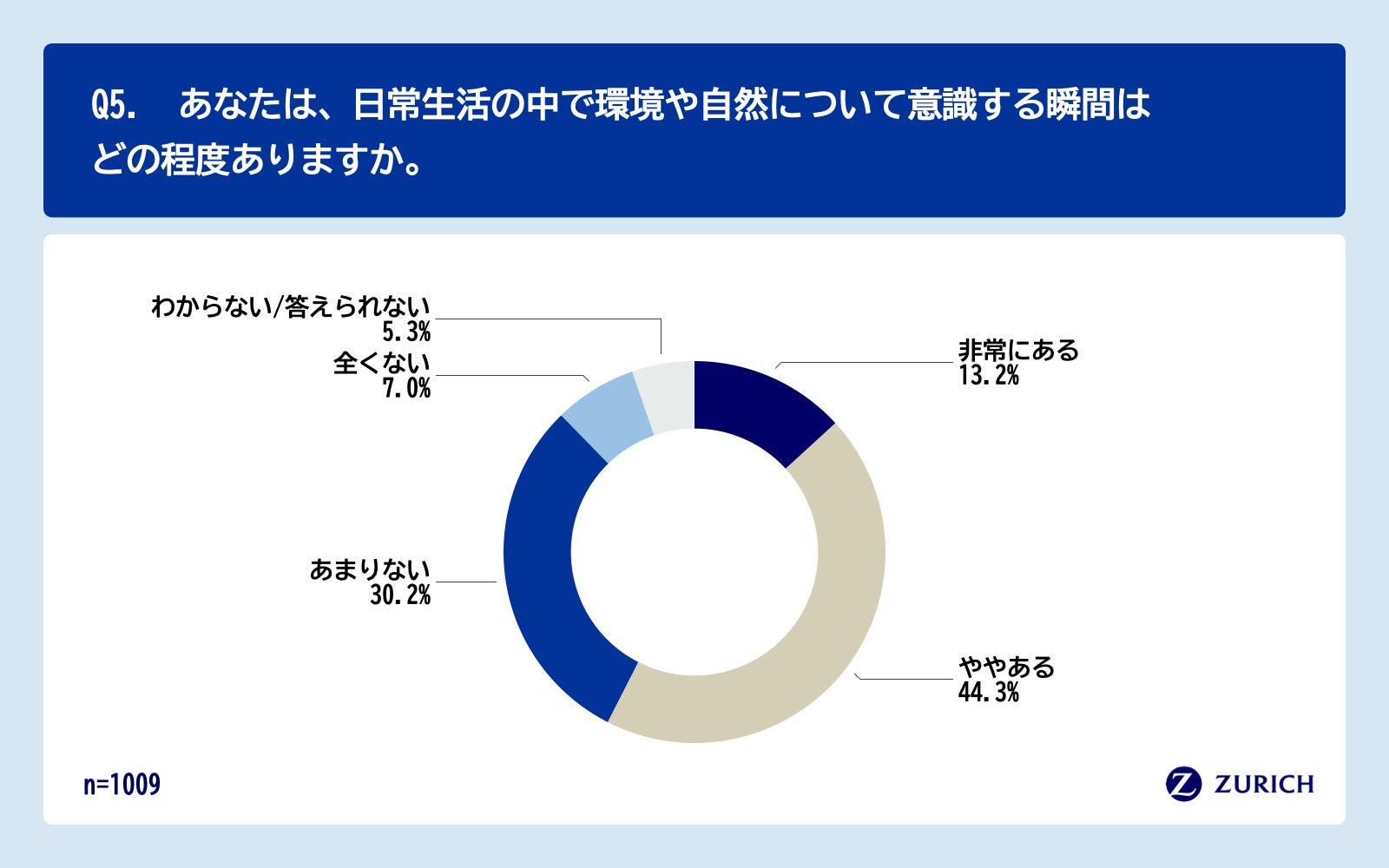 「Q5.あなたは、日常生活の中で環境や自然について意識する瞬間はどの程度ありますか。」(n=1009)と質問したところ、「非常にある」が13.2%、「ややある」が44.3%という回答となりました。