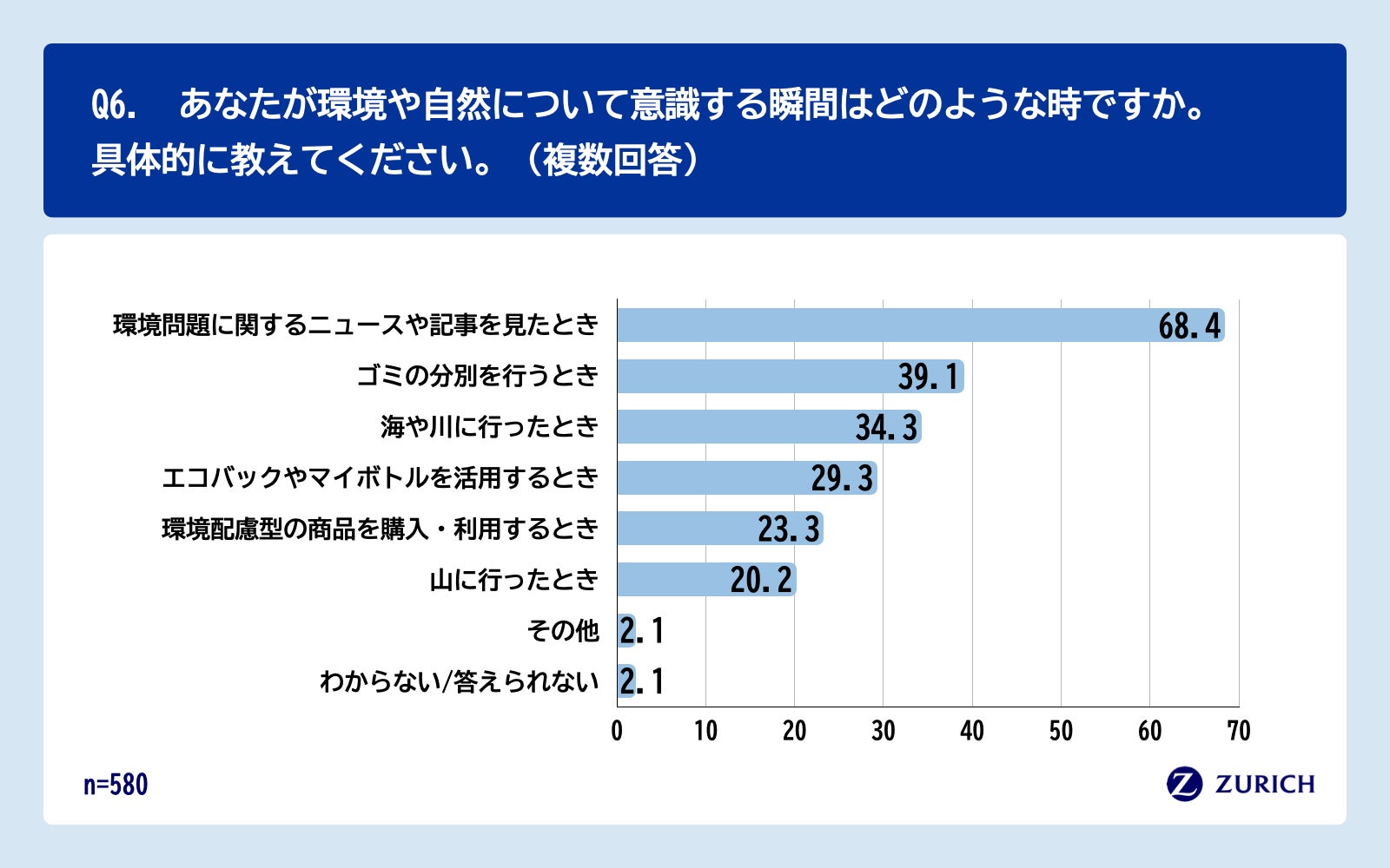 Q5で「非常にある」「ややある」と回答した方に、「Q6.あなたが環境や自然について意識する瞬間はどのようなときですか。具体的に教えてください。(複数回答)」(n=580)と質問したところ、「環境問題に関するニュースや記事を見たとき」が68.4%、「ゴミの分別を行うとき」が39.1%、「海や川に行ったとき」が34.3%という回答となりました。