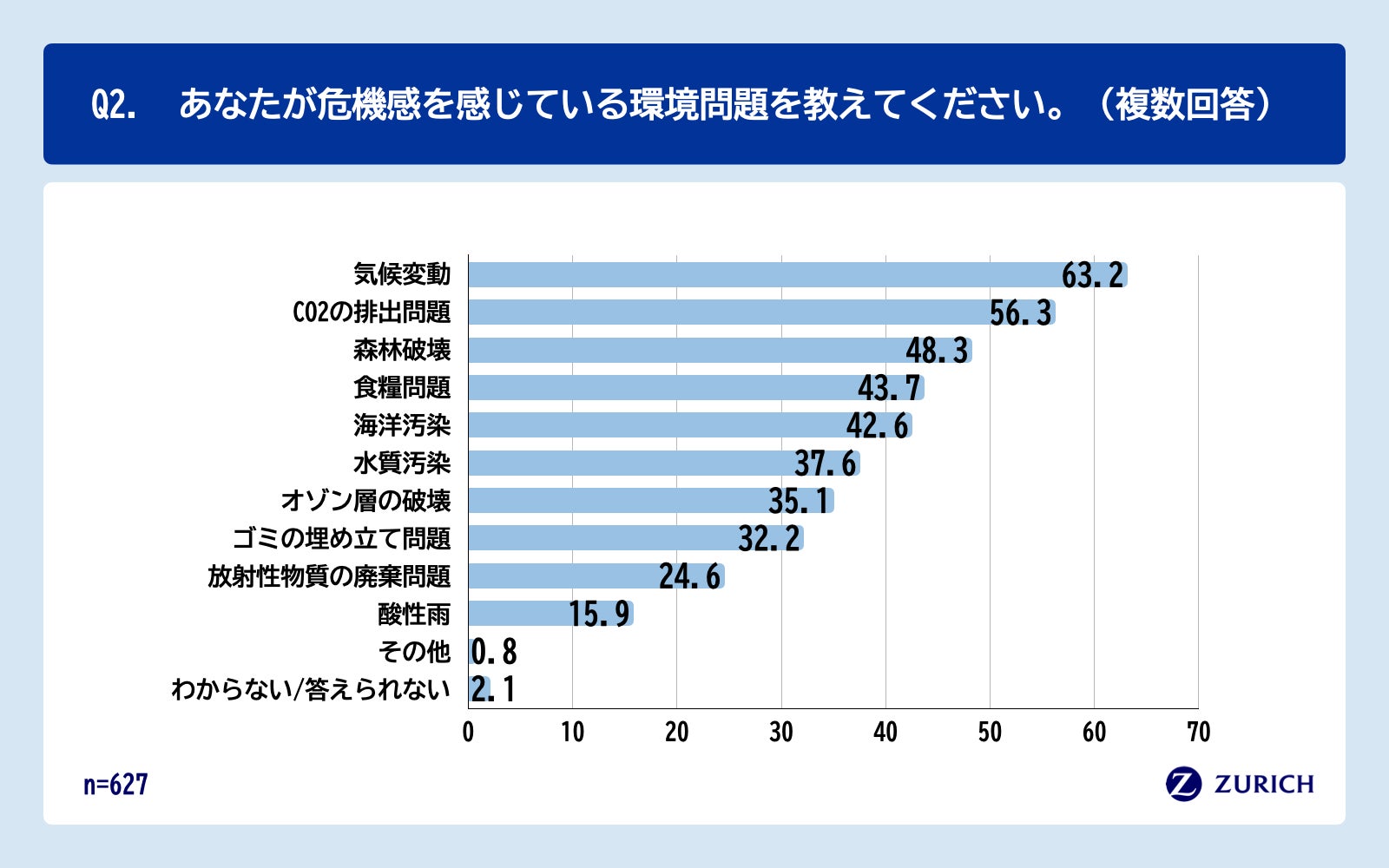Q1で「非常に危機感を感じている」「やや危機感を感じている」と回答した方に、「Q2.あなたが危機感を感じている環境問題を教えてください。(複数回答)」(n=627)と質問したところ、「気候変動」が63.2%、「CO2の排出問題」が56.3%、「森林破壊」が48.3%という回答となりました。