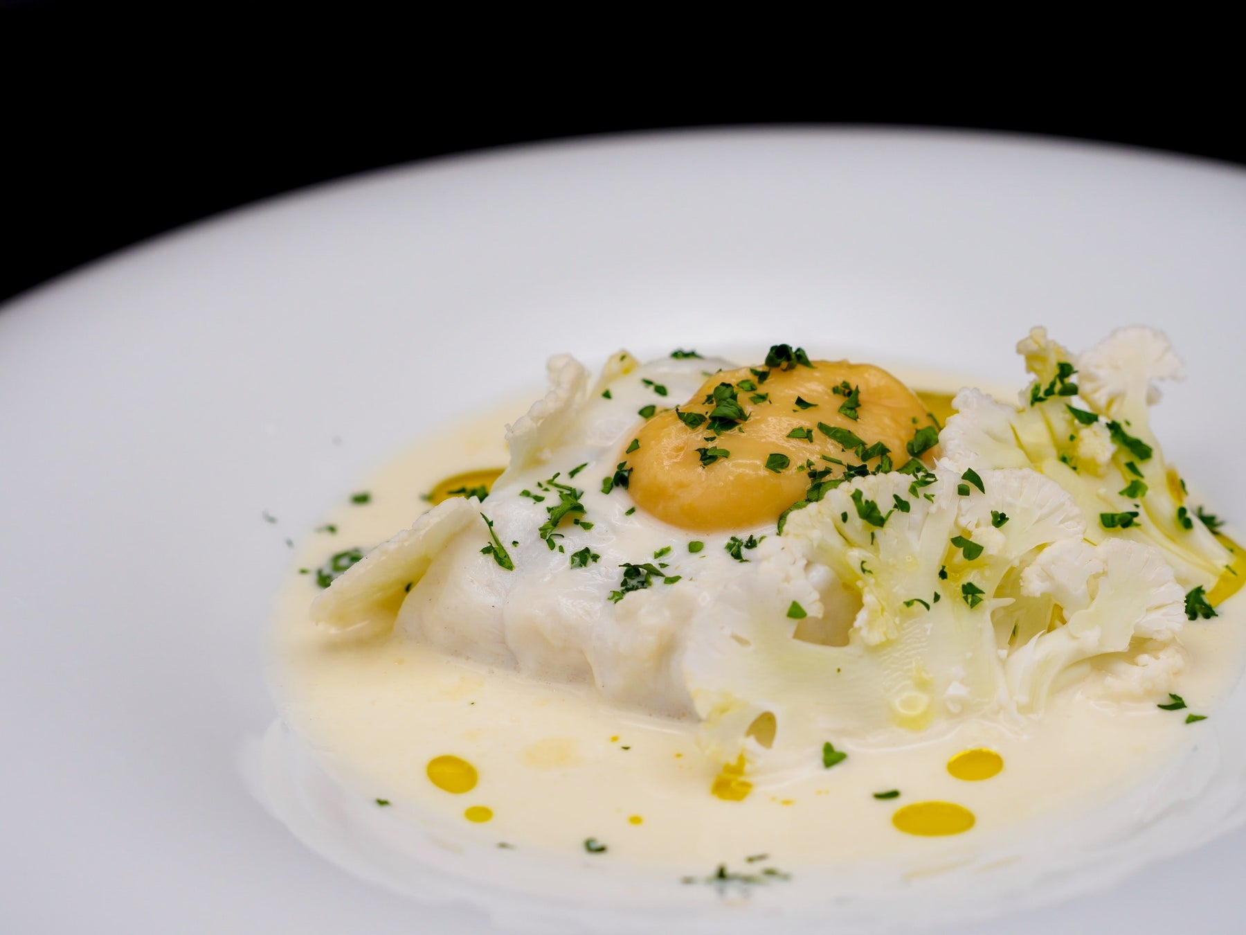 旬を迎えた鱈を昆布締めにし、蒸し焼きにしてカリフラワーのスープ仕立てにいたしました。