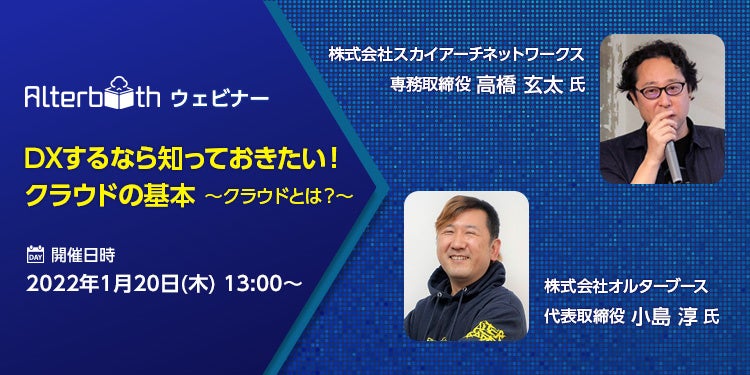 クラウドネイティブ化ソリューションを提供する株式会社オルターブース (本社:福岡県福岡市、代表取締役:小島 淳、以下 オルターブース)は、 DXの支援を目的としたクラウドの基本を解説するウェビナーを1月20日(木)に開催します。