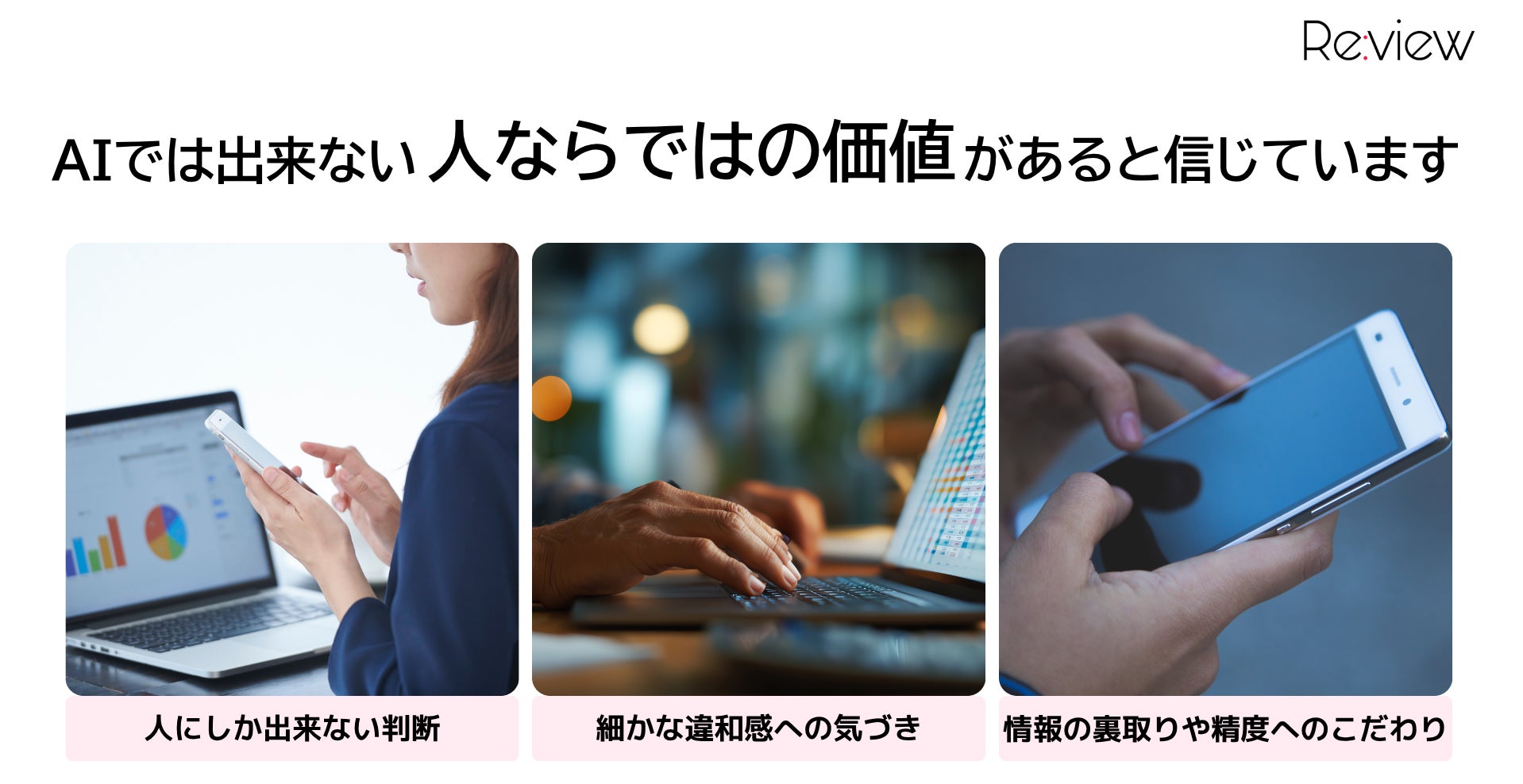 「人」と「AI」が補い合うことで、社会は豊かになると思っています。Reviewは、その「人のチカラ」の価値を引き出し続ける会社でありたいと考えています。