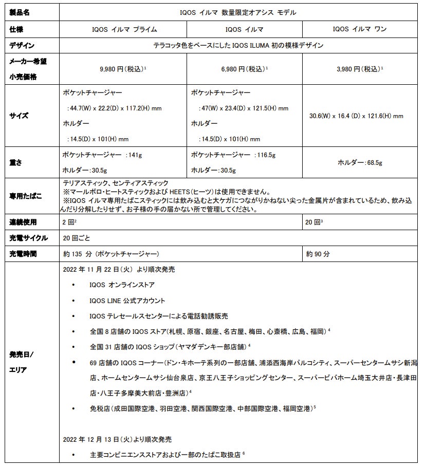 フィリップ モリス ジャパン合同会社(本社:東京都千代田区、社長:シェリー・ゴー、以下「PMJ」)は、ブレードをなくし、使用後のクリーニングが不要になるスマートコア・インダクション・システム®を搭載した加熱式たばこ「IQOS イルマ シリーズ」の「IQOS イルマ プライム」、「IQOS イルマ」、「IQOS イルマ ワン」より、初の模様デザインを施した数量限定製品「IQOS イルマ オアシス モデル」を、11月22日(火)から、IQOS オンラインストア、IQOS LINE公式アカウント、IQOSテレセールスセンターによる電話勧誘、および全国8店舗※のIQOSストア、IQOSショップ(ヤマダデンキ一部店舗)、IQOSコーナー(ドン・キホーテ系列一部店舗他)で発売いたします。その後、12月13日(火)から、主要コンビニエンスストアおよび一部のたばこ取扱店で、順次発売いたします。