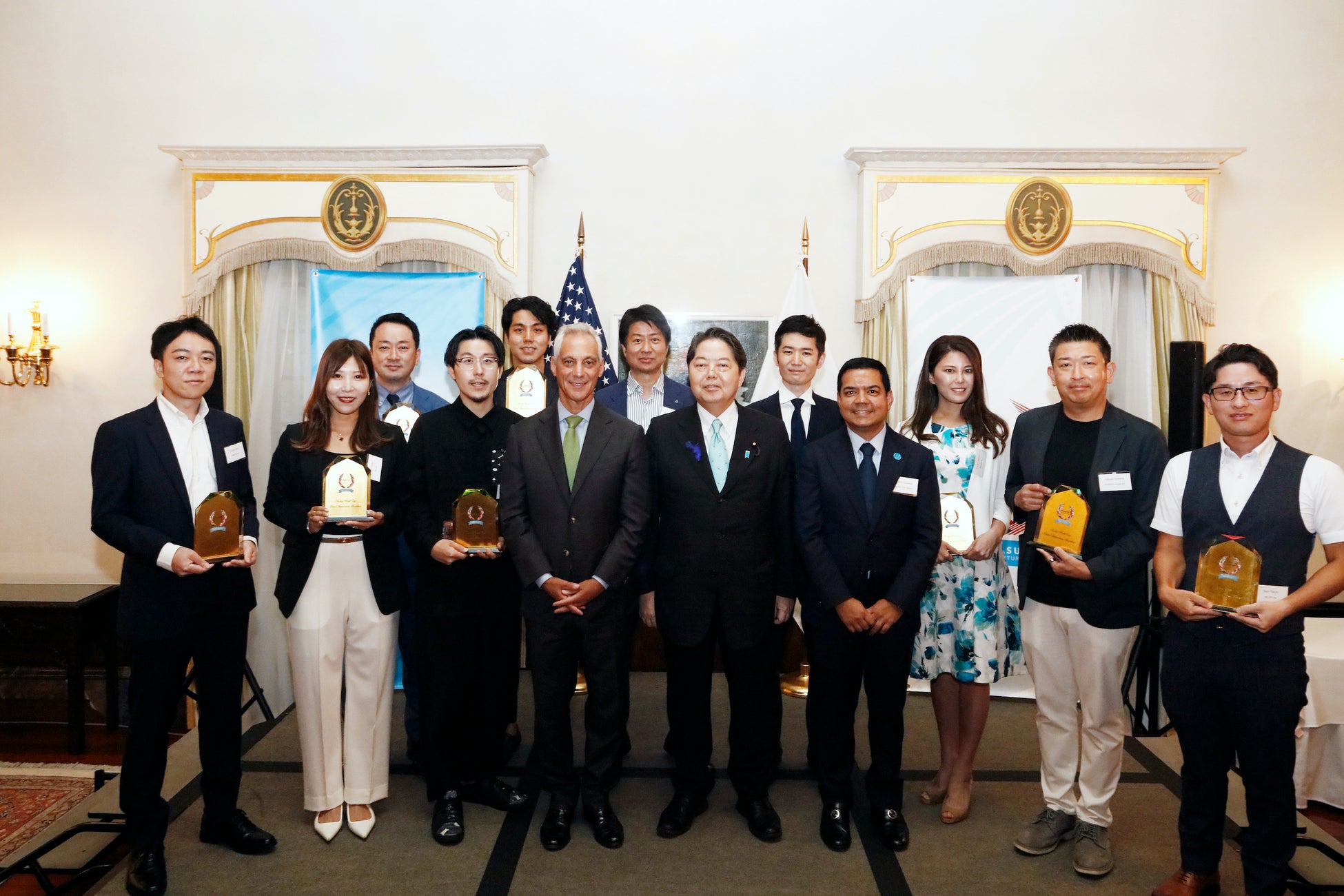 また日本のスタートアップ業界をリードし、グローバル規模で事業拡大を進める優れたスタートアップ10社が、ラーム・エマニュエル米国大使より表彰の楯を手渡しされました。