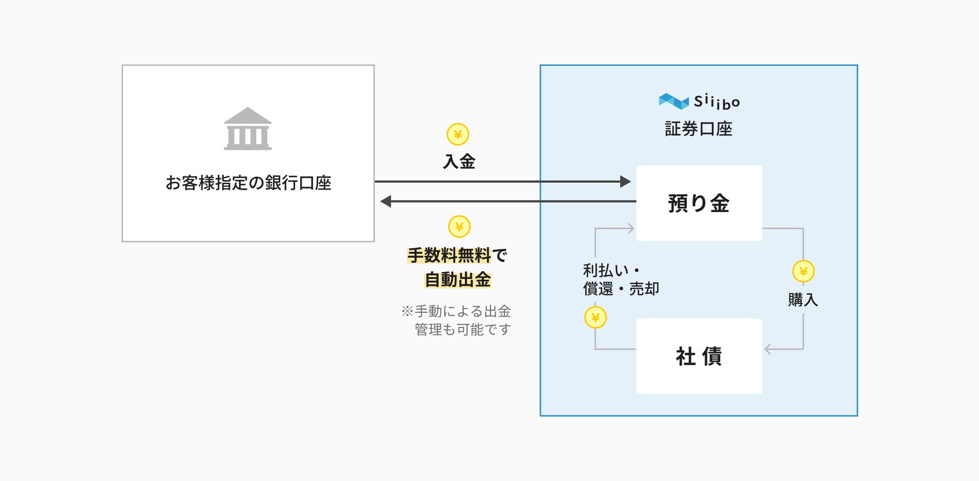 預り金自動出金サービスの設定を有効にすることで、各利払い日・償還日・中途換金受渡日の翌営業日に、当該受渡金額が自動的に登録済みの銀行口座へ出金されます。自動出金に上限金額はなく、振込手数料はすべてSiiibo証券が負担いたします。