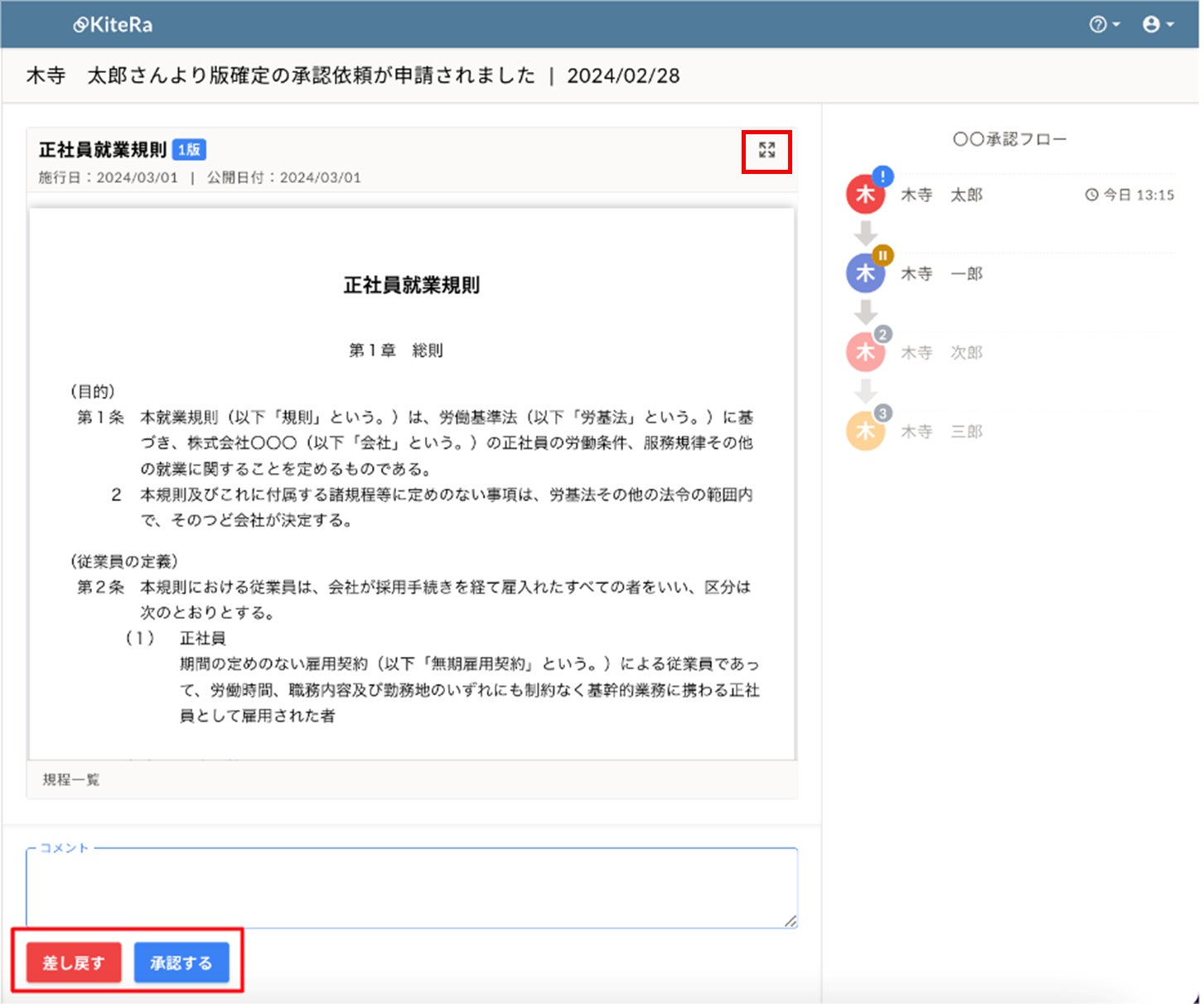 実際に導入したところ、「KiteRa Biz」には新旧対照表の自動生成、規程文書の体裁の統一化、条番号の自動修正、届出の電子申請などの機能が実装されているため、従来に比べ作業時間が大幅に削減されていることを実感できております。