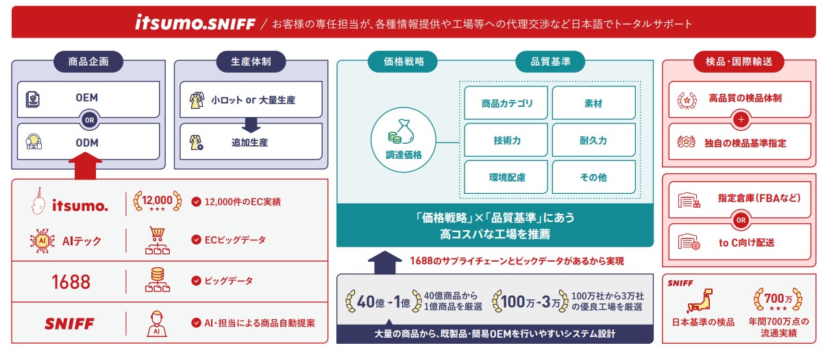 SNIFFは、主に日本のECセラーに対し、あらゆる商品の調達から、日本基準の検品体制、倉庫保管、日本国内への国際輸送など海外からの調達・仕入業務を一気通貫で提供する「THE直行便」サービスを提供しており、BtoB 越境ECサービスのリーディングカンパニーです。
