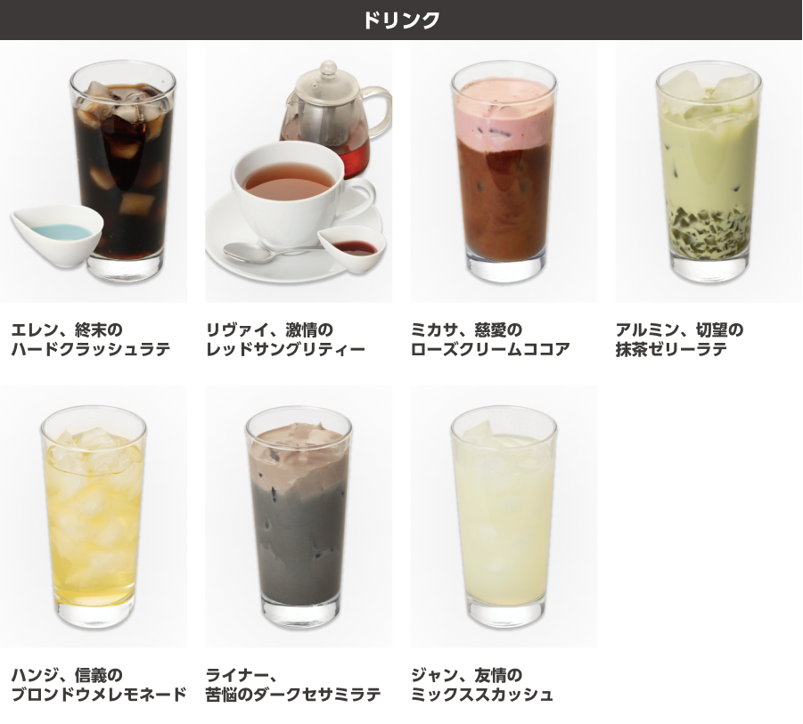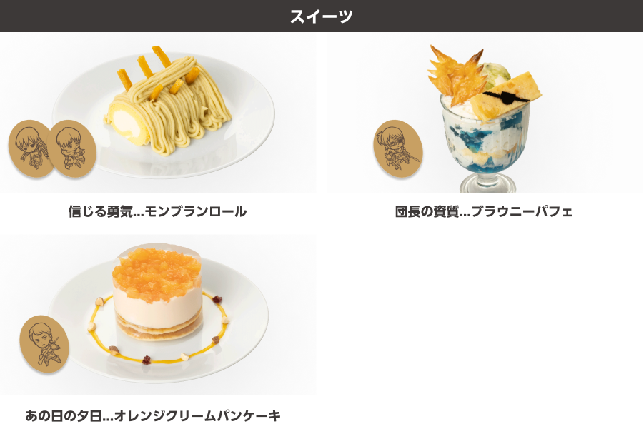 ハンジが抱える調査兵団の団長としての苦悩をイメージしたブラウニーパフェです。翼型のパイや白と青のゼリーで調査兵団の紋章を表現し、ブラックココアパウダーでハンジの眼帯をデコレーションしたレモン風味のホワイトチョコブラウニーを添えています。調査兵団のマントをイメージした濃茶ソースのアイスもアクセントになっています。