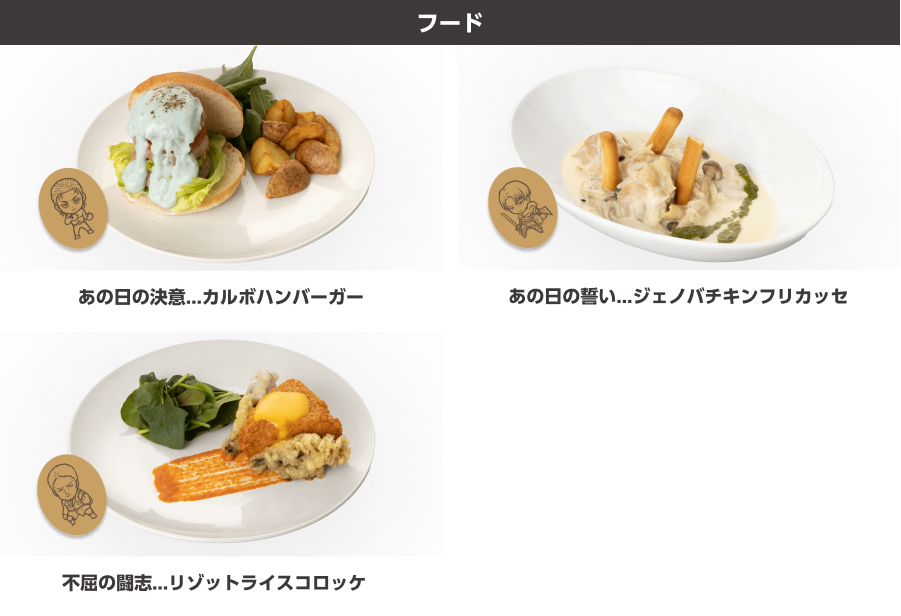 心の葛藤を抱えながら何度も立ち上がり戦い続けるライナーの闘志をイメージしたリゾットライスコロッケです。トマトソースベースの赤いライスコロッケに、まいたけの天ぷらを添え、黄色く光る目のようなオランデーズソースをかけて戦い続ける鎧の巨人を表現しました。目の前の敵と戦い続けるライナー闘志のような赤いトマトチーズソースを添えています。