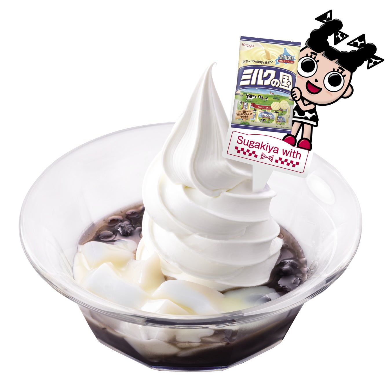 春日井製菓の「ミルクの国」と、スガキヤの定番である「クリームぜんざい」がコラボしたスイーツメニューです。さっぱりとしたソフトクリームにミルクの国風味のソースをかけ、ミルクの国風味のプリンを添えました。ほっくりとした北海道産大納言小豆がミルクの味わいとマッチしたスガキヤラーメンを食べた後にぴったりなスイーツです。