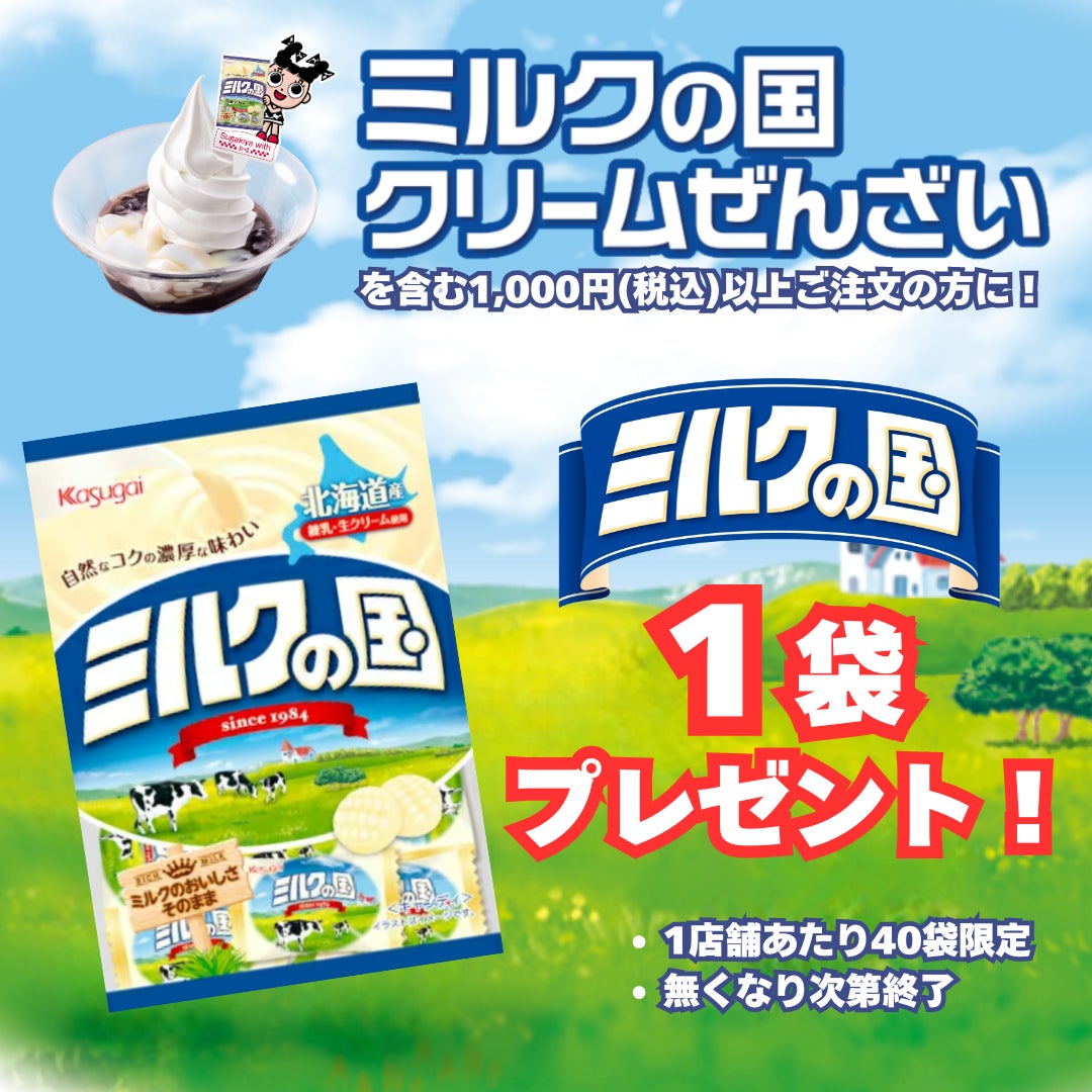 2024年8月8日(木)より、全国のスガキヤ店舗(一部店舗を除く)にてコラボスイーツ「ミルクの国クリームぜんざい」を含む1,000円以上(税込)ご注文いただいた方に、各店舗先着40名様限定で「ミルクの国」を1袋プレゼントいたします。やさしい味わいの「ミルクの国」をぜひお楽しみください。
