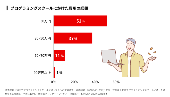 [5]30代がプログラミングスクールにかけた費用は「〜30万円」だったと約半数が回答