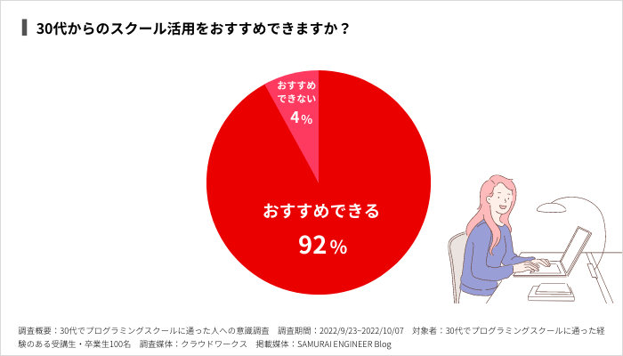 【プログラミングスクールに通った30代への意識調査】30代の92%がスクール活用を「おすすめできる」と回答