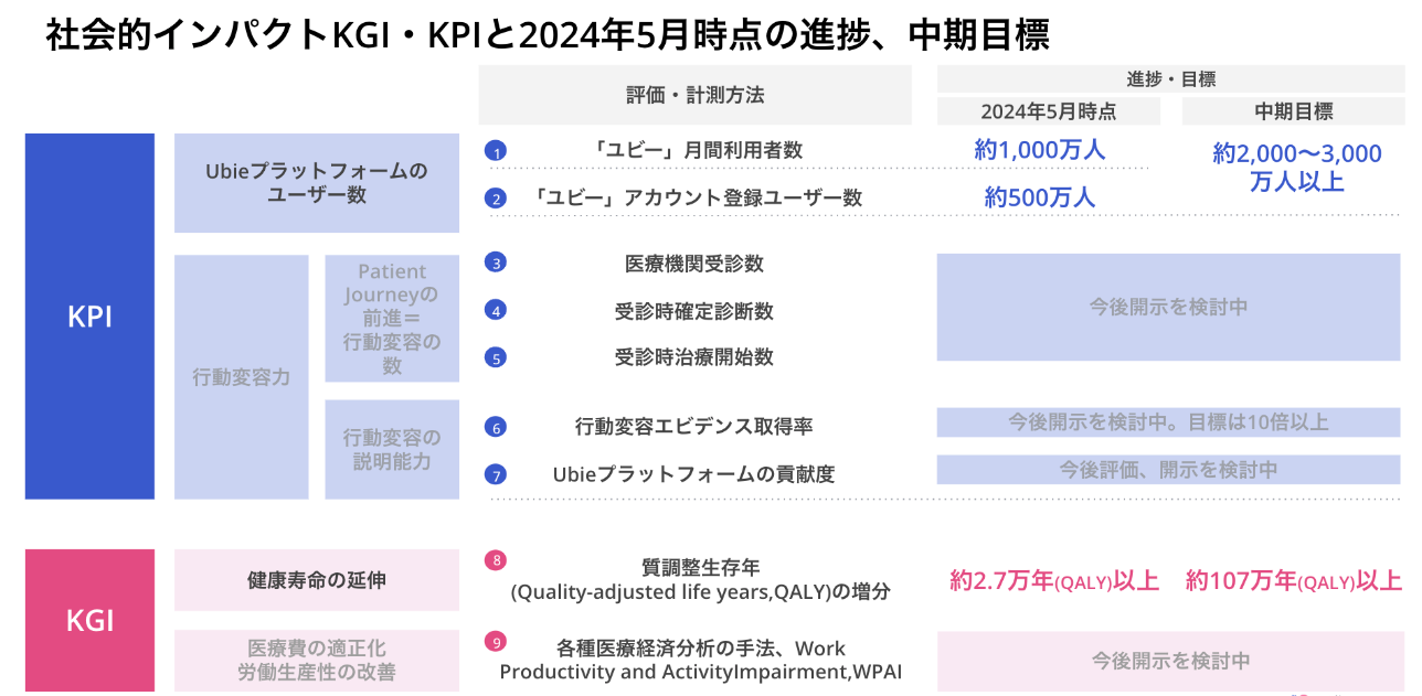 今後Ubieは、社会的インパクト指標の測定を通じて、ステークホルダーと共に貢献する価値の定量、定性的な評価を行うとともに、ステークホルダーとのより建設的な対話、より効果的な経営方針の策定・実行等に積極的に活用します。また、社会貢献と財務的成長が相乗効果を生む独自のビジネスモデルを一層加速し、持続可能な社会課題解決と経済成長の両立、そしてミッション・ビジョンの実現に向けて取り組んでまいります。
