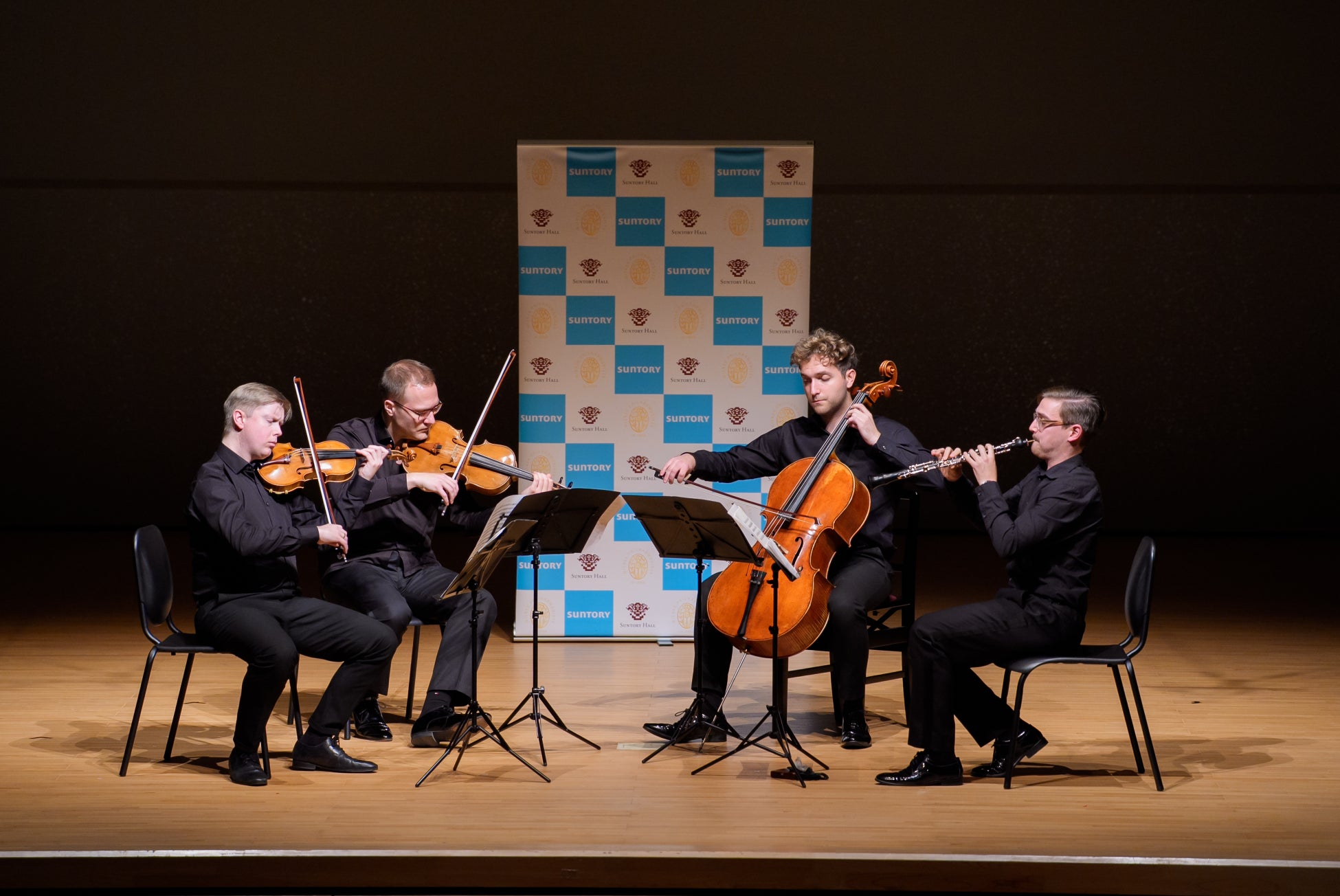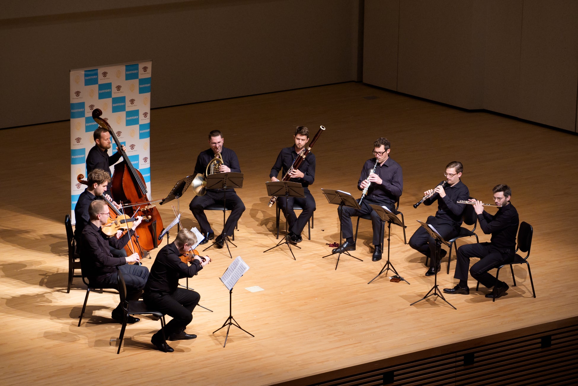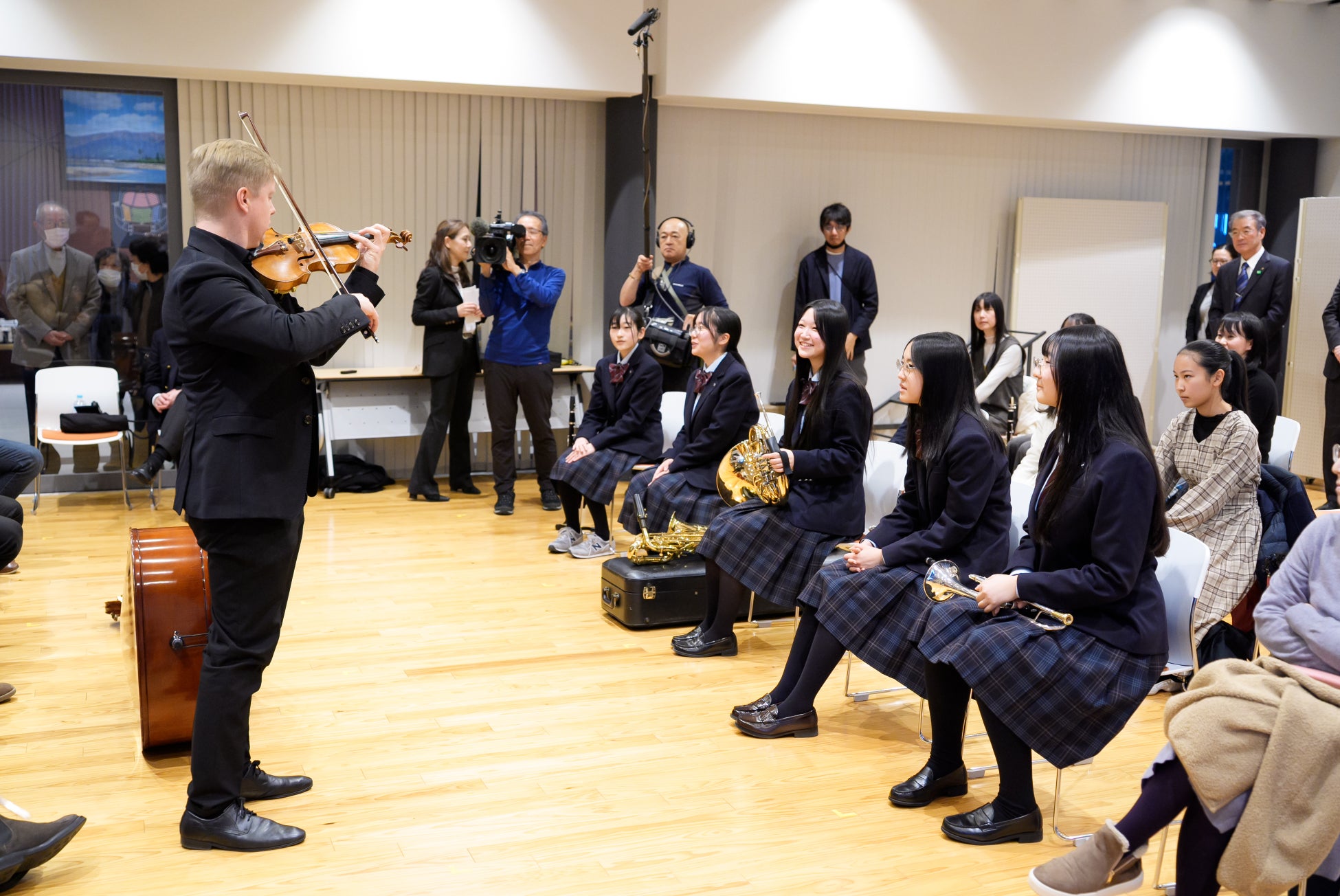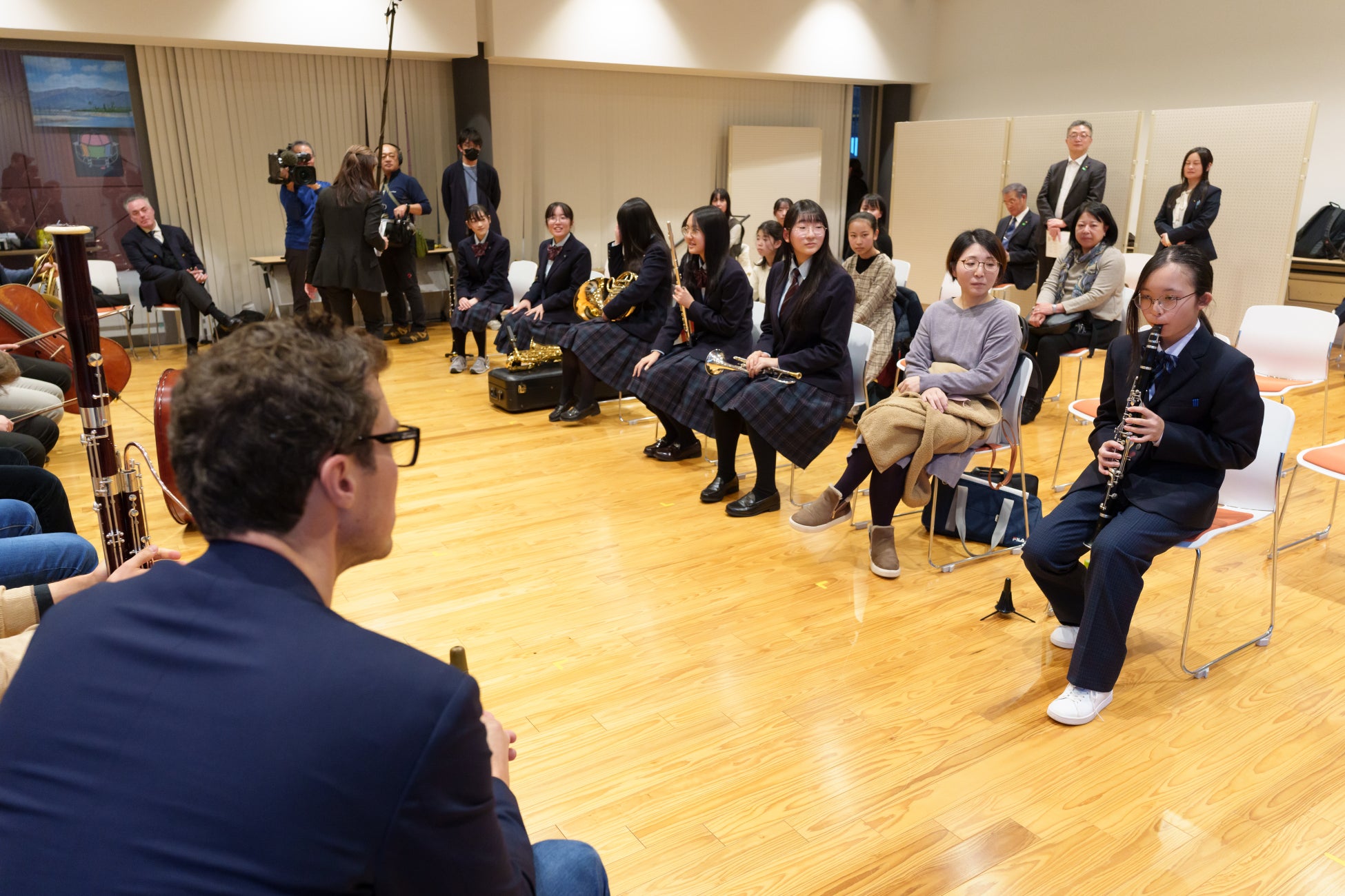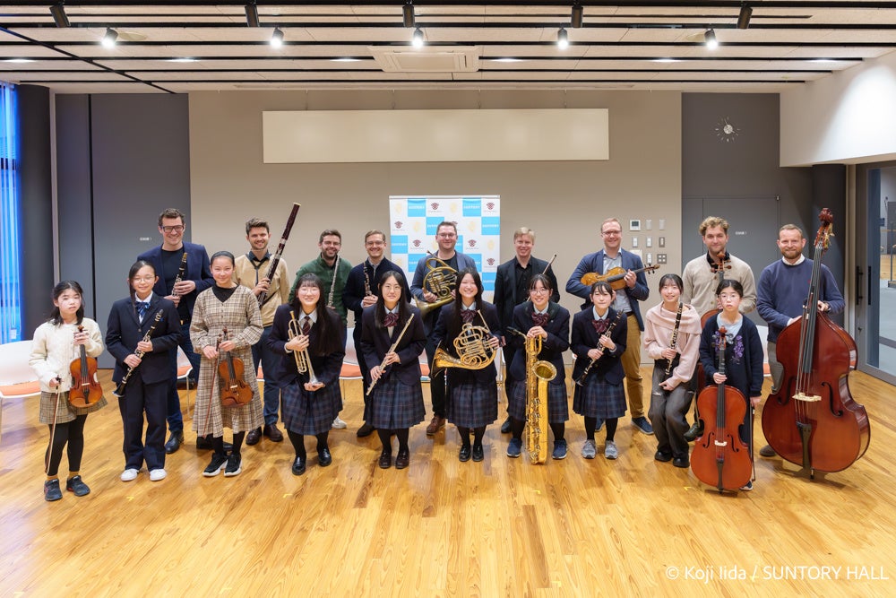 コンサートでは、ウィーン・フィル楽団員が、ヴァンハル:オーボエ四重奏曲 ヘ長調 作品7-1と、ラハナー:九重奏曲 へ長調 作品22の2曲を演奏しました。交流会で指導を受けた吹奏楽部の生徒は「なかなかオーケストラの演奏会を聴く機会も少ない中、憧れのオーケストラであるウィーン・フィルのみなさんと直接話す機会を持ててとても感激した。演奏で自分が悩んでいたことに、親しみをもって教えてくれて嬉しい。練習中に気を付けることなど、明日から早速実践したい」と感想を述べました。